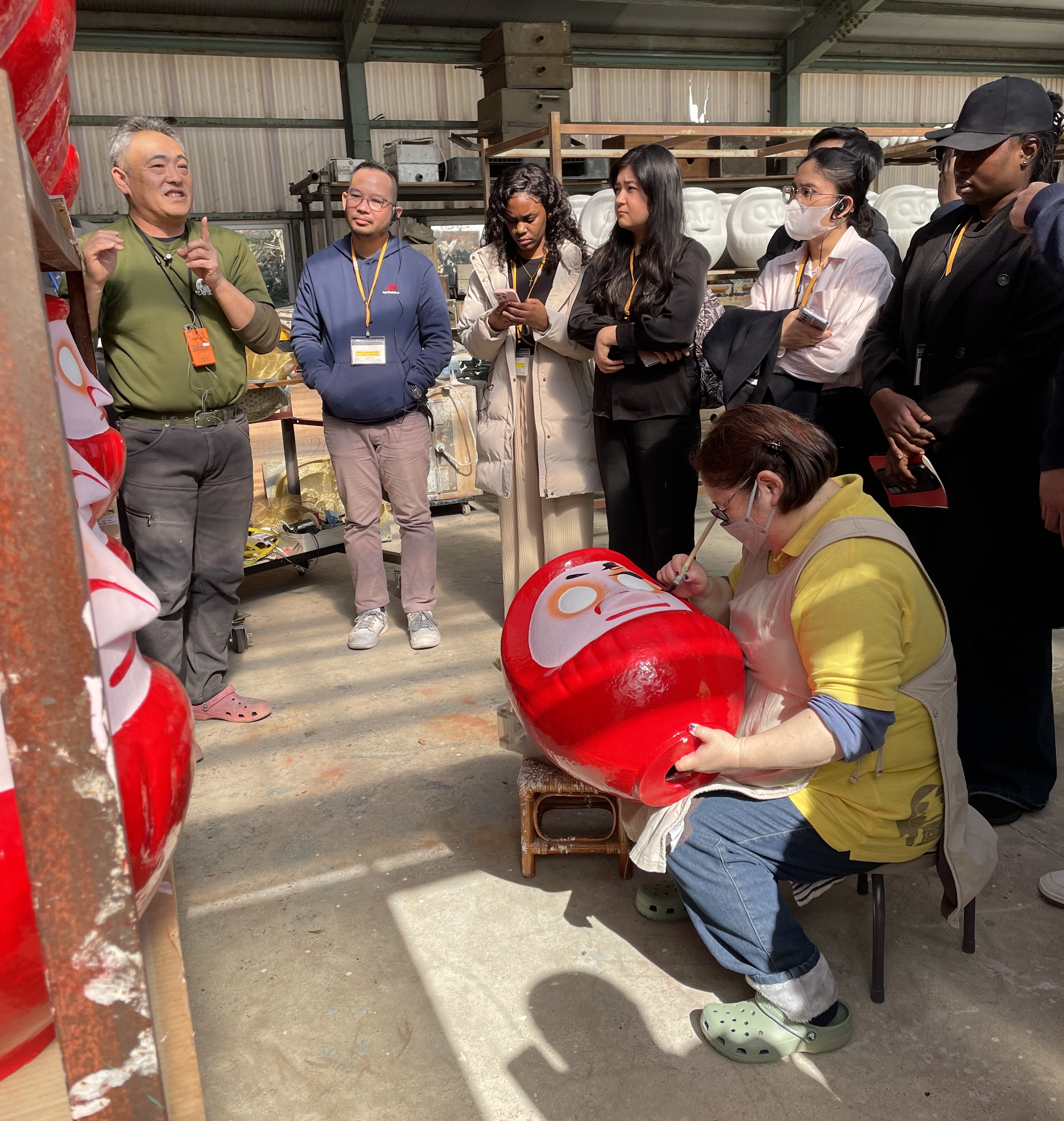 参加者は「だるまの幸喜」を訪問し高崎だるまの歴史、製作工程、産業としての変遷について説明を受けた後、実際にだるまの絵付けを体験しました。同社は、だるまの成形から仕上げまでの全工程を一貫して行う、現在では非常に貴重な工房です。
