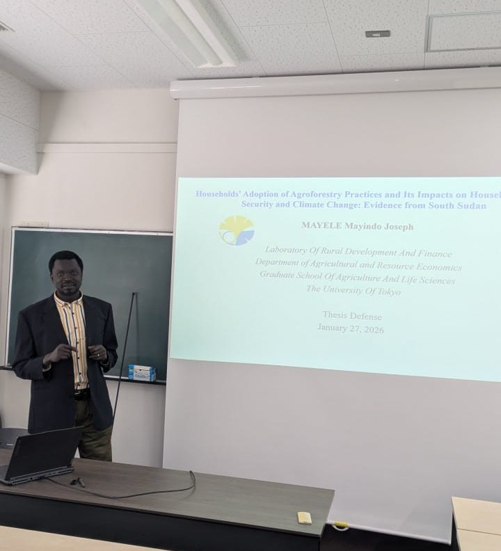 南スーダンのMAYELE Mayindo Josephさん、リベリアのKOLLEH Jacob B さん、そしてザンビアのCHILUFYA Chungaさんは、東京大学大学院農学生命科学研究科農業・資源経済学専攻を櫻井武司教授のご指導の下、2026年3月24日に修了しました。
