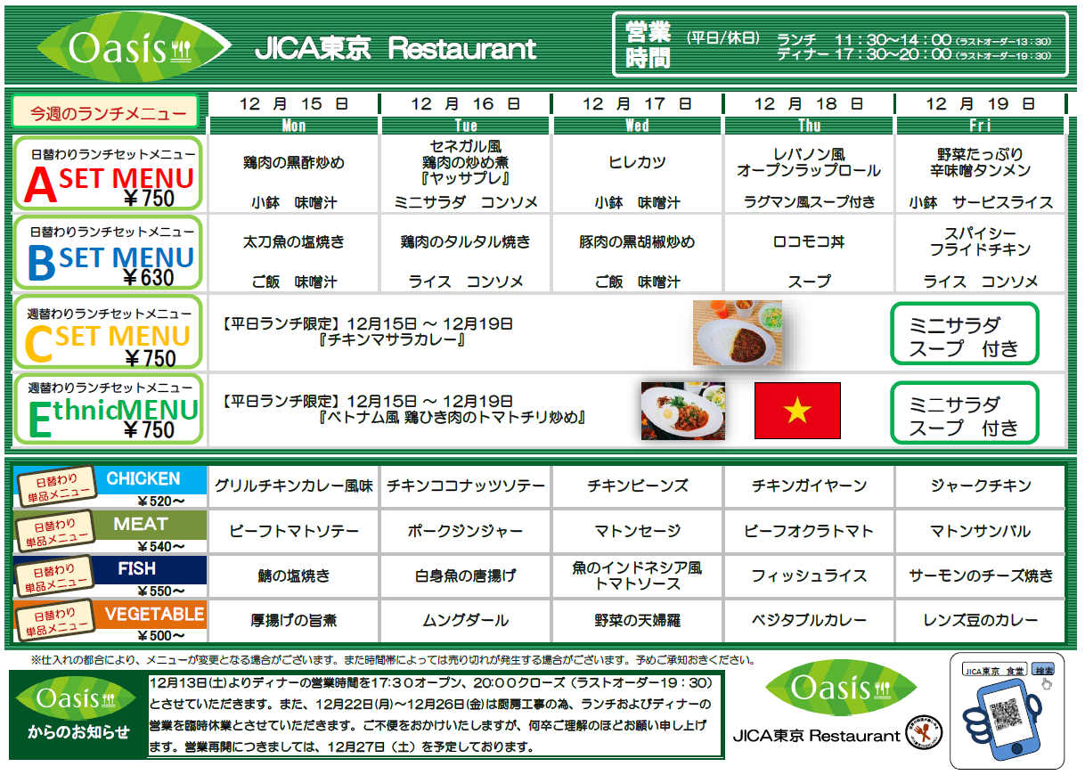 JICA東京の1階にある食堂『Oasis』は、地域の皆様、一般の方々にも広くご利用いただけます。週替わりで様々な国の料理をご提供しており、ハラールに配慮した食事のご用意もございます。