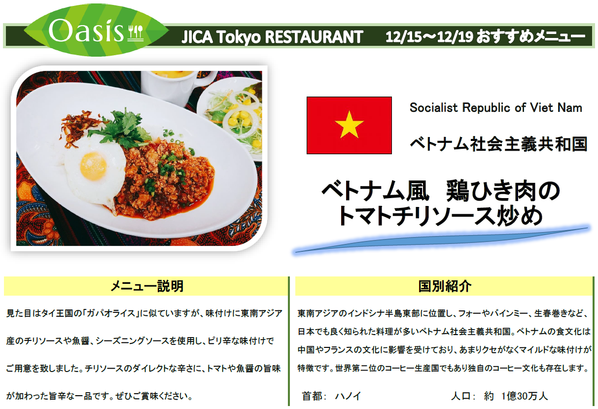 ベトナム風鶏ひき肉のトマトチリソース炒めをおすすめ致します。東南アジア産のチリソースや魚醤、シーズニングソースを使用したピリ辛な味付けにしています。