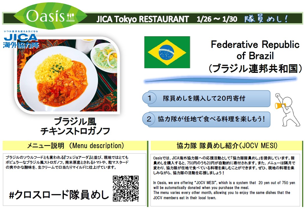 おすすめランチは1月26日(月)~30日(金)のエスニックセット 海外協力隊応援メニュー【隊員めし】 『ブラジル風チキンストロガノフ』です。ブラジルのソウルフードともいわれるフェジョアーダと並び、現地はとてもポピュラーなブラジル風ストロガノフ。南米原産とされるトマトや粒マスタードの爽やかな酸味を生クリームでマイルドに仕上げています。ぜひお召し上がりください。