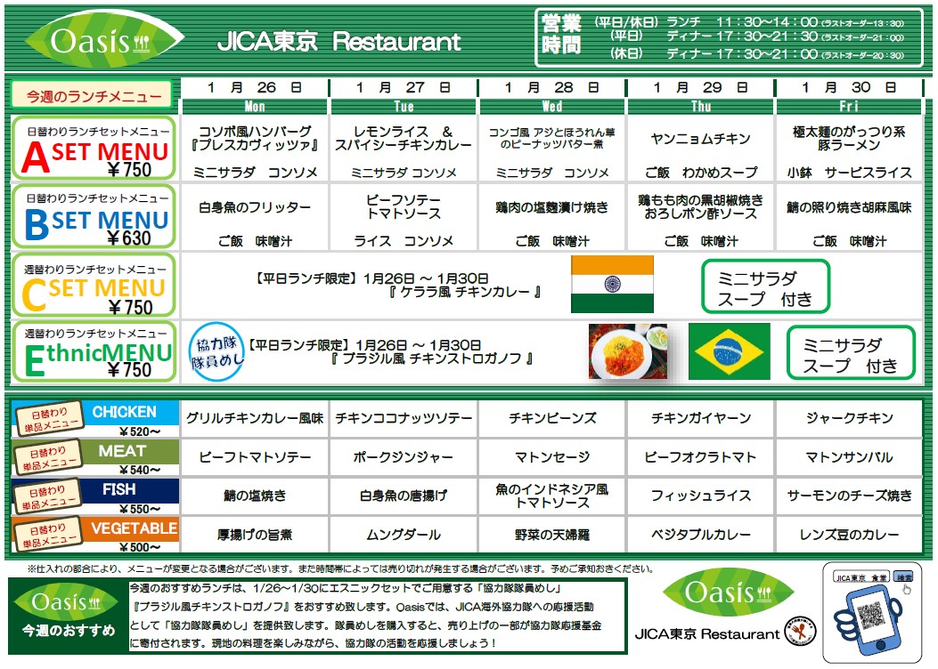 ※Oasisでは、JICA海外協力隊への応援活動として「隊員めし」を提供いたします。