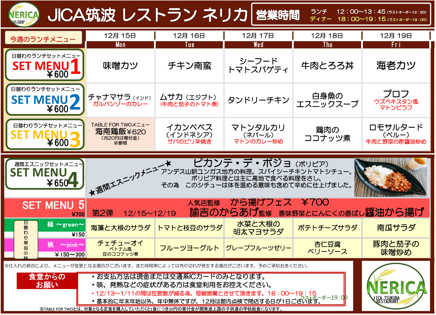 施設公開日やイベントで大人気のJICA筑波レストラン「NERICA」は、通常の営業時間にもどなたでもご利用いただけます。いろんな国の言葉が飛び交うレストラン「NERICA」で、世界に思いを馳せながらエスニックフードをお楽しみください!