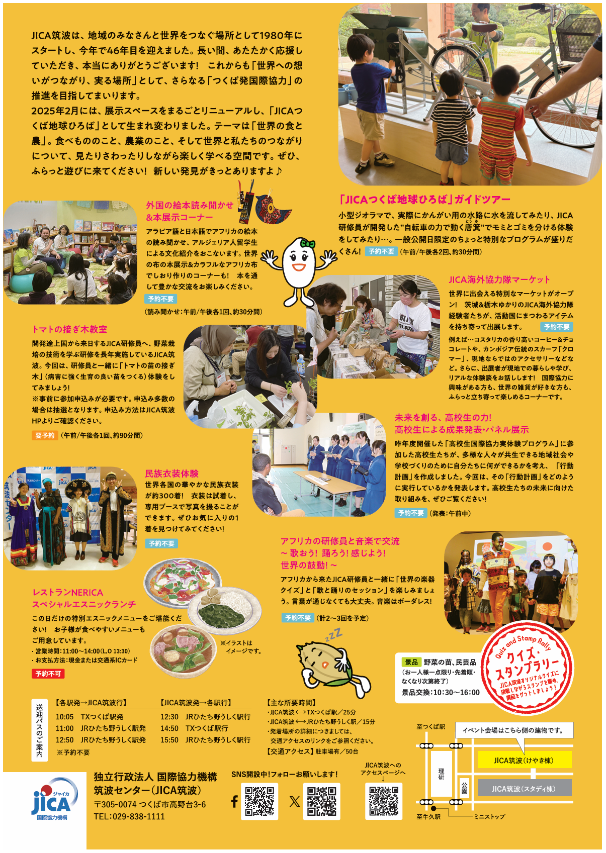 一般公開では、昨年好評だったJICA職員による「JICAつくば地球ひろば」の解説付きガイドツアーを今年もお楽しみいただけます。世界の食と農のあれこれについて、ツアー参加者だけが楽しめる、他ではなかなか味わえない内容が盛りだくさんです。