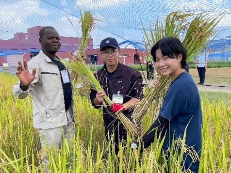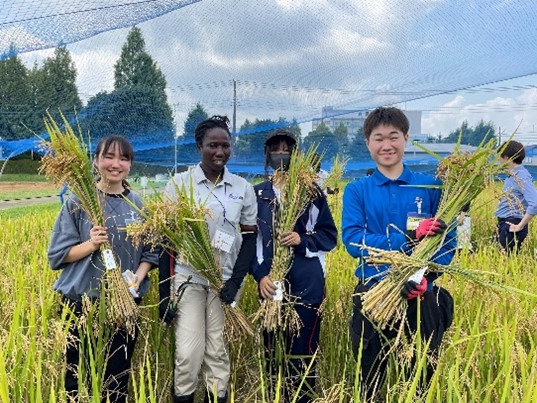 ディスカッションでお互いの取り組みについて理解を深めた後は、研修員たちが各国の稲作の課題解決のために実験を行っている田んぼに行き、収量を調査するための1㎡の円を実際に紐と棒を用いて描き、その範囲に生えている稲を刈り取る作業に挑戦しました。初めての方法に最初は戸惑う高校生もいましたが、研修員の動きを真似ながら理解を深め、作業が進むにつれて笑顔と交流が自然と生まれていきました。「農」を通した交流は、研修員たちにとっても充実した楽しい時間になったようです!