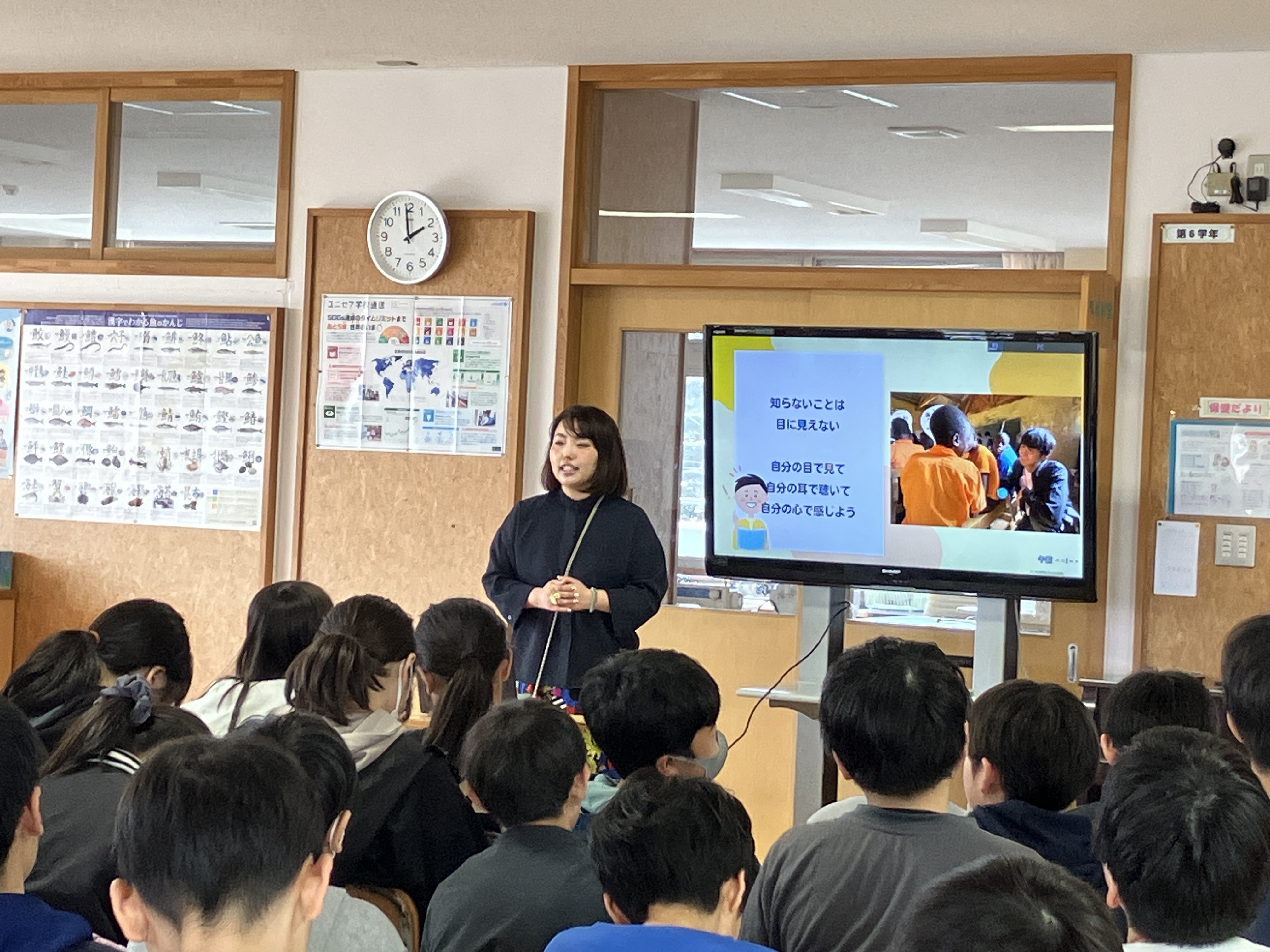 卒業を間近に控えた子どもたちは、海外の暮らしや文化、協力しあう大切さについての話に夢中で耳を傾け、教室には熱心な雰囲気が広がりました。講師がフィリピンでの経験談やJICAの仕事を紹介すると、「学校に行けない子どもはどれくらいいるの?」「大変だったことは何ですか?」と、次々と質問があがり、自分の学びとして深めようとする姿が見られました。