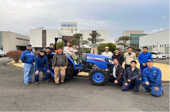 はじめに、井関農機株式会社より会社概要や商品開発の歴史、海外市場戦略、グローバル展開についてご説明いただきました。続いて、農業機械の基礎知識や作業機の着脱方法など座学と実習を交えた講義が行われました。さらに、同社の研修圃場において参加者全員がトラクターによる耕うん実習を体験しました。