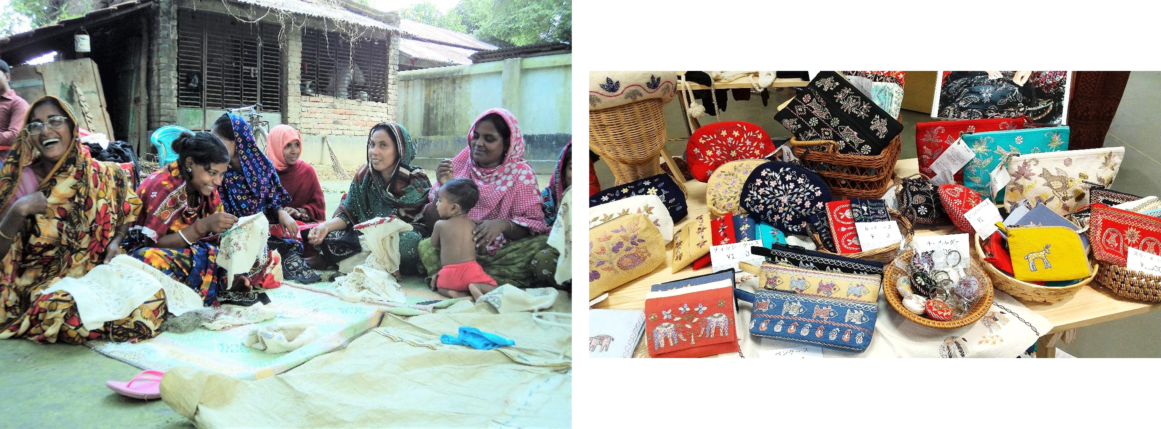 私たちは、お母さんたちの生活の知恵から生まれたバングラデシュ伝統の「ノクシカタ刺しゅう」製品を販売します。