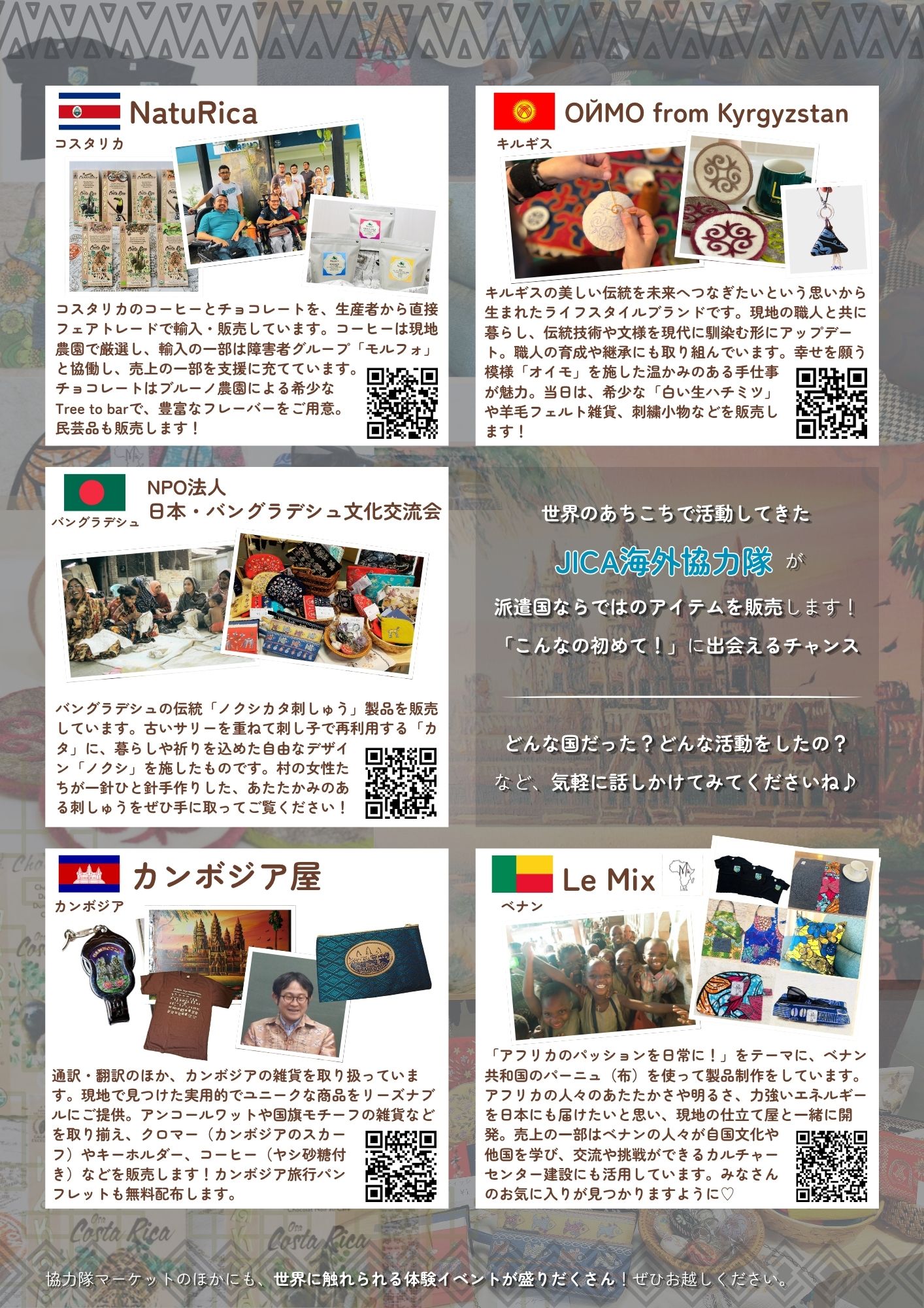 活動国ならではのコーヒーや食品、雑貨、手工芸品などを販売します。