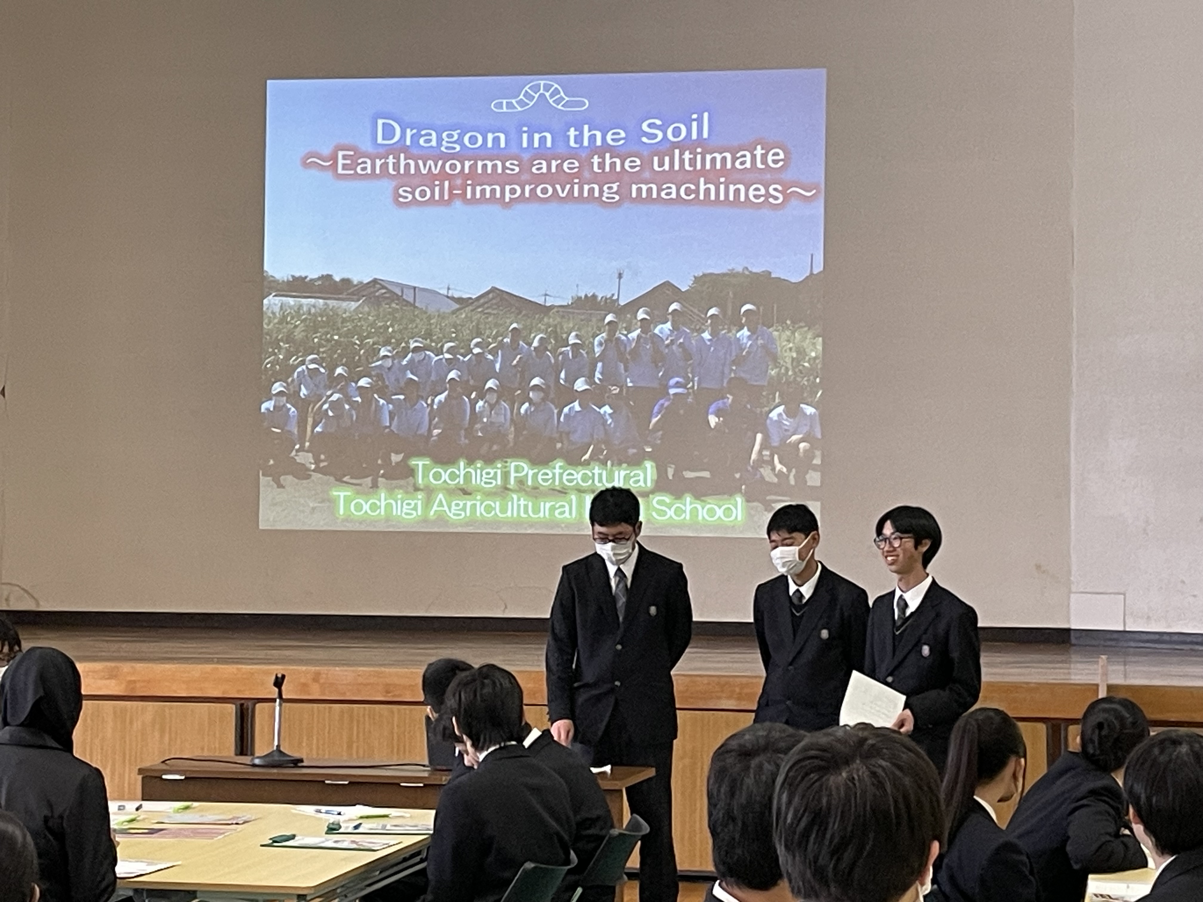 生徒の皆さんは、日頃取り組んでいる ミミズたい肥についての研究を英語で発表し、研修員も興味深く耳を傾けていました。