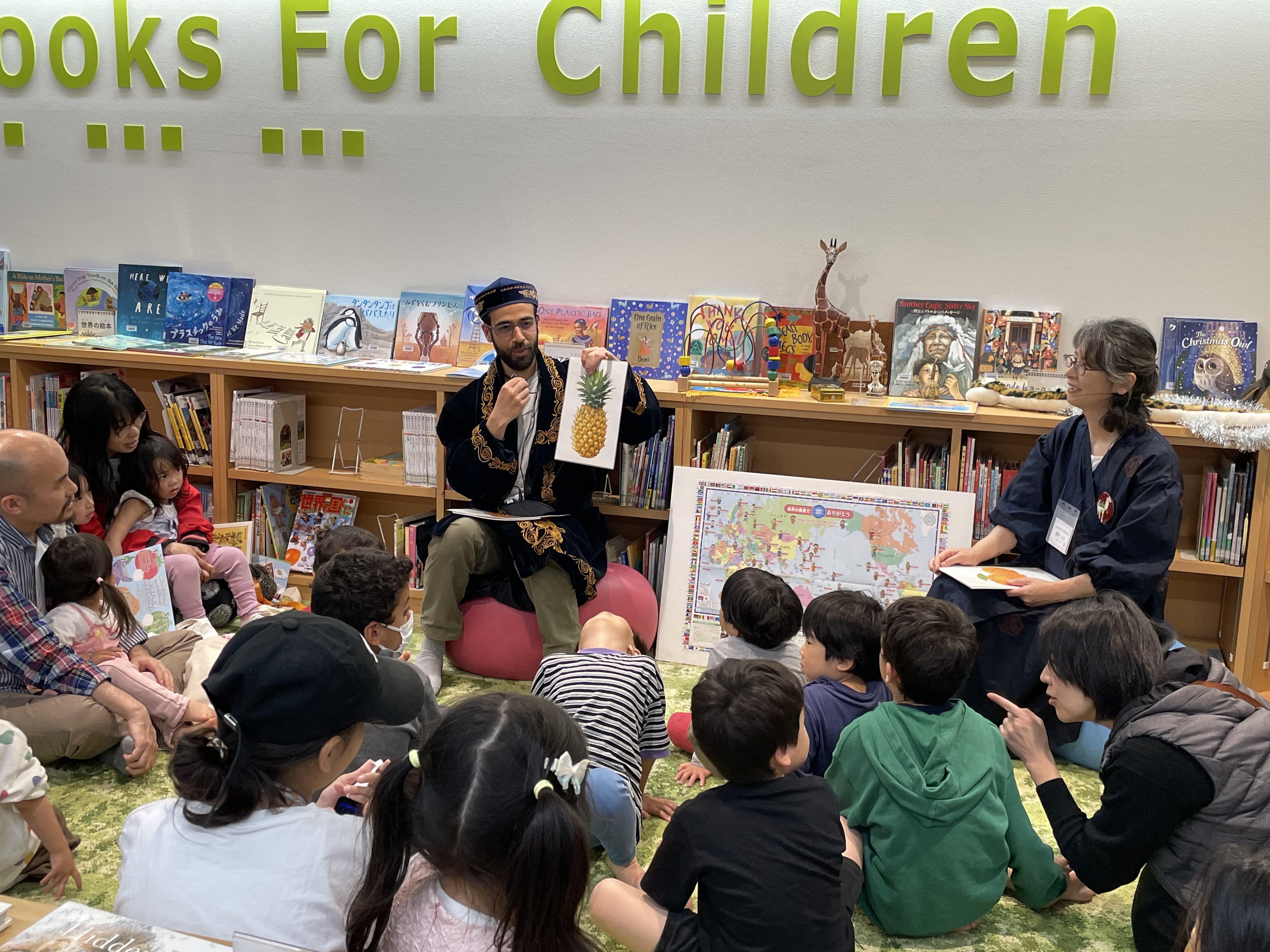 アルジェリア人留学生のイスラムさんの読み聞かせに、み~~~んな夢中!読み聞かせの後は、絵本に出てきたくだものをアラビア語で言う練習をしました。カラフルなアフリカ布のしおり作りも大好評でした!