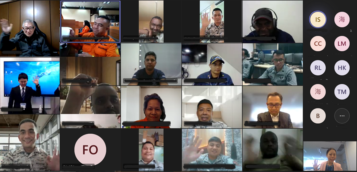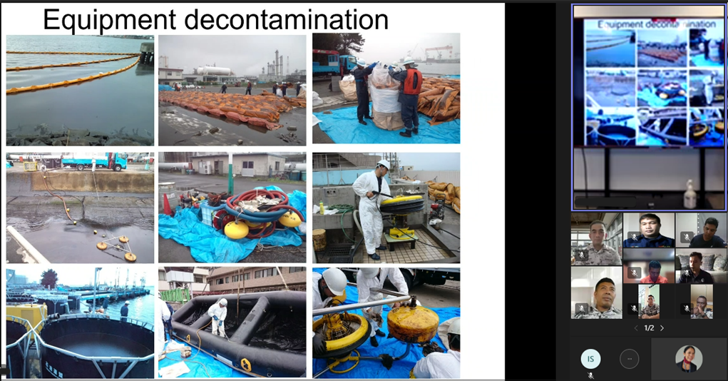 今回の研修では、今年度の研修を実施した公益財団法人海上保安協会職員がモデレーター役となり、研修コースの実習の目玉の1つである、海水・湖水などに流れ出た油分を取り除く「油防除」の実習時の動画を教材の一つとして取り入れました。また、我が国唯一の油防除訓練を実施している「一般財団法人海上災害防止センター」が講義を実施し、救難・環境・防災の様々な分野で活躍をしている帰国研修員が、研修で得た知識を同僚と現場で共有できる解り易い資料も作成しました。このように、オンラインでありながら現場感が良く伝わる研修となりました。