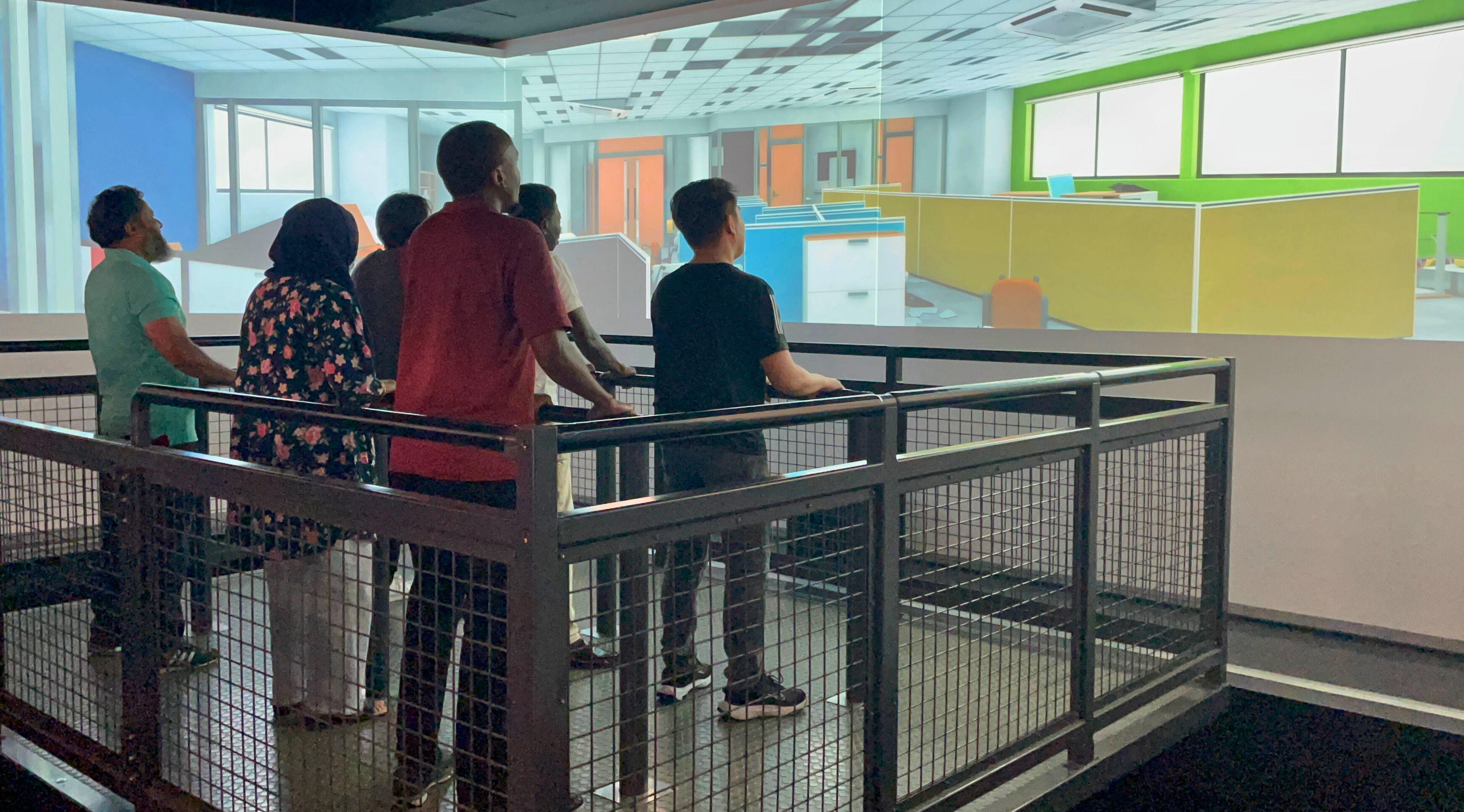 地震・火災体験ツアーでは、地震シミュレーターによる揺れの体験のほか、家の中で地震が発生したときにどう動くのか、2つのグループに分かれて実践したほか、地震後に高確率で発生する火災について、煙の中での避難方法や消火器の使い方を学びました。