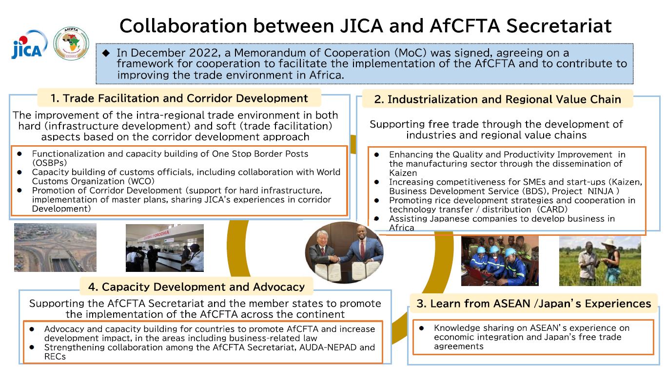 JICA and AfCFTA Secretariat signed a MOC (Memorandum of Cooperation) in December 2022 and agreed to strengthen cooperation in four priorities, namely, 1) Trade Facilitation and Corridor Development, 2) Industrialization and Value Chain, 3) Learn from ASEAN/ Japan’s Experiences, and 4) Capacity Development and Advocacy (see below ※ for more details).