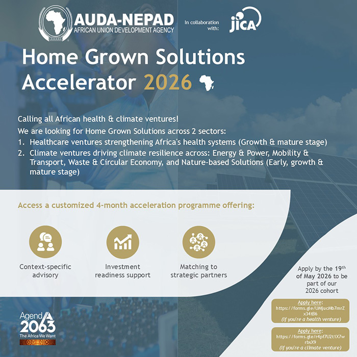 Apply by the 19th of May 2026 to be part of the 2026 cohort of the AUDA-NEPAD Home Grown Solutions Accelerator, designed to support growth and mature stage African ventures in healthcare and now expanding to cover early, growth and mature-stage climate ventures!