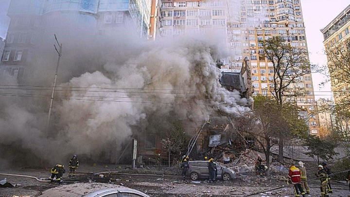 Destroyed buildings and rescue teams in central Kyiv