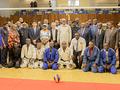 On September 9, the inauguration ceremony was held in Kinshasa, the capital of the Democratic Republic of the Congo (DRC), for the completion of the Judo Sports Center built under the grant aid of "The Project for Construction of Judo and Sports Center." From the DRC side, Minister of the Interior, Mr. Kazadi, Minister of Sports and Leisure, Mr. Kabulo, the Deputy Commissioner General of the Congolese National Police, Mr. Van Ang, and from the Japan side, Mr. Minami Hiroyuki, Ambassador Extraordinary and Plenipotentiary of the DRC, Mr. Murakami Hironobu, Chief Representative of JICA DRC Office attended the ceremony.
