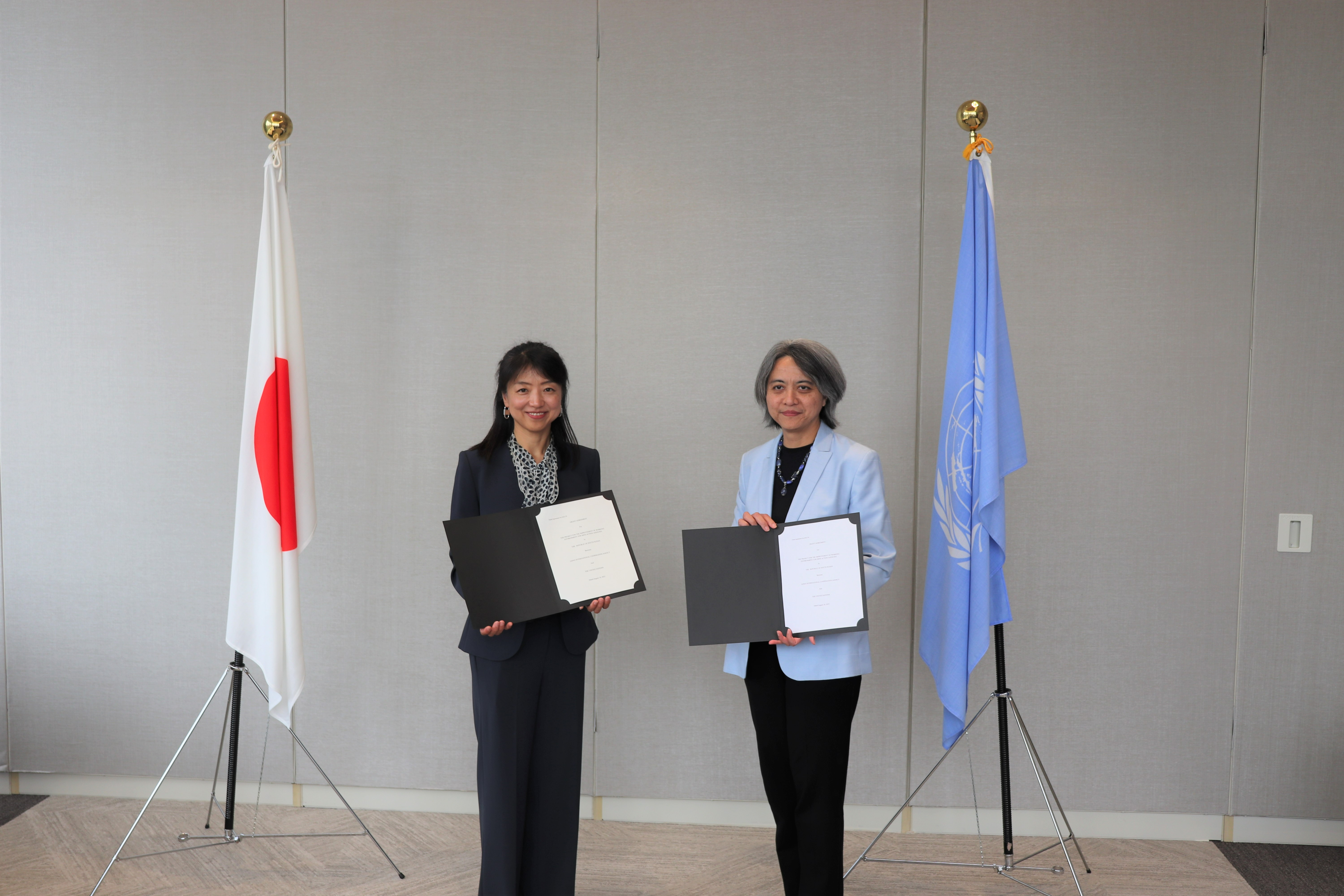 On August 18, the Japan International Cooperation Agency (JICA) signed a grant agreement with the United Nations Mine Action Service (UNMAS) in New York, USA, to provide a grant aid for the Project for the Improvement of Working Environment for Mine Action Agencies. The signatures were exchanged between Deputy Director of UNMAS Rita Gunaryati Lubis and Chief Representative of JICA USA Office Tanaka Satoko. The Project is JICA's first initiative with UNMAS after the Memorandum of Cooperation signed between JICA and UNMAS this June.