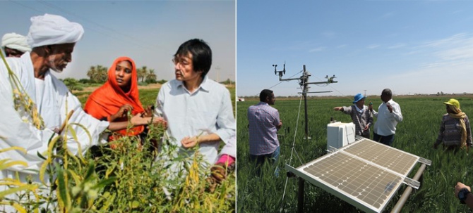 (Left) Harvesting peanuts that have been grown via an irrigation project in the semi-arid River Nile state. (Right) Weather observation equipment has been installed to predict the effects of climate change on wheat cultivation.
