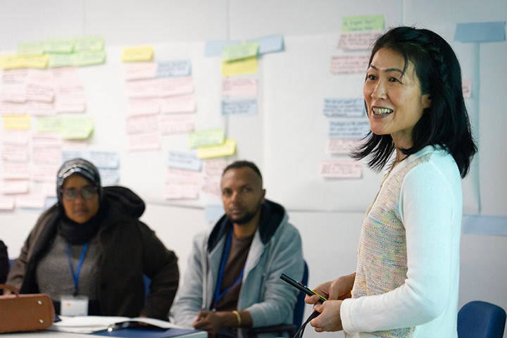 JICA continues to offer training in seikatsu kaizen. Here, Senior Advisor Ota Miho leads a class for trainees from African countries, including Ethiopia and Ghana.
