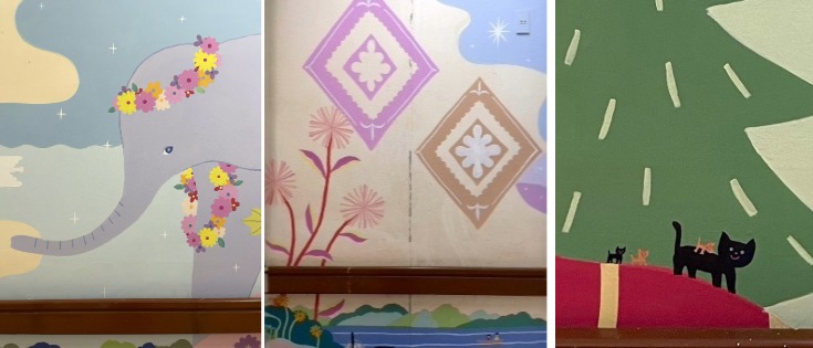 The completed murals featured Lulu's signature motifs of nature and animals, along with local UNESCO World Heritage sites, patterns from traditional clothing, and even a painting of kittens born in the hospital, all to everyone's delight. The once sterile and cold hospital environment was transformed, with many commenting, "It's beautiful" and "It doesn't feel like a hospital anymore." A man who had just undergone surgery looked at the artwork with a cheerful expression. There was even a doctor who proudly said, "I painted this part."