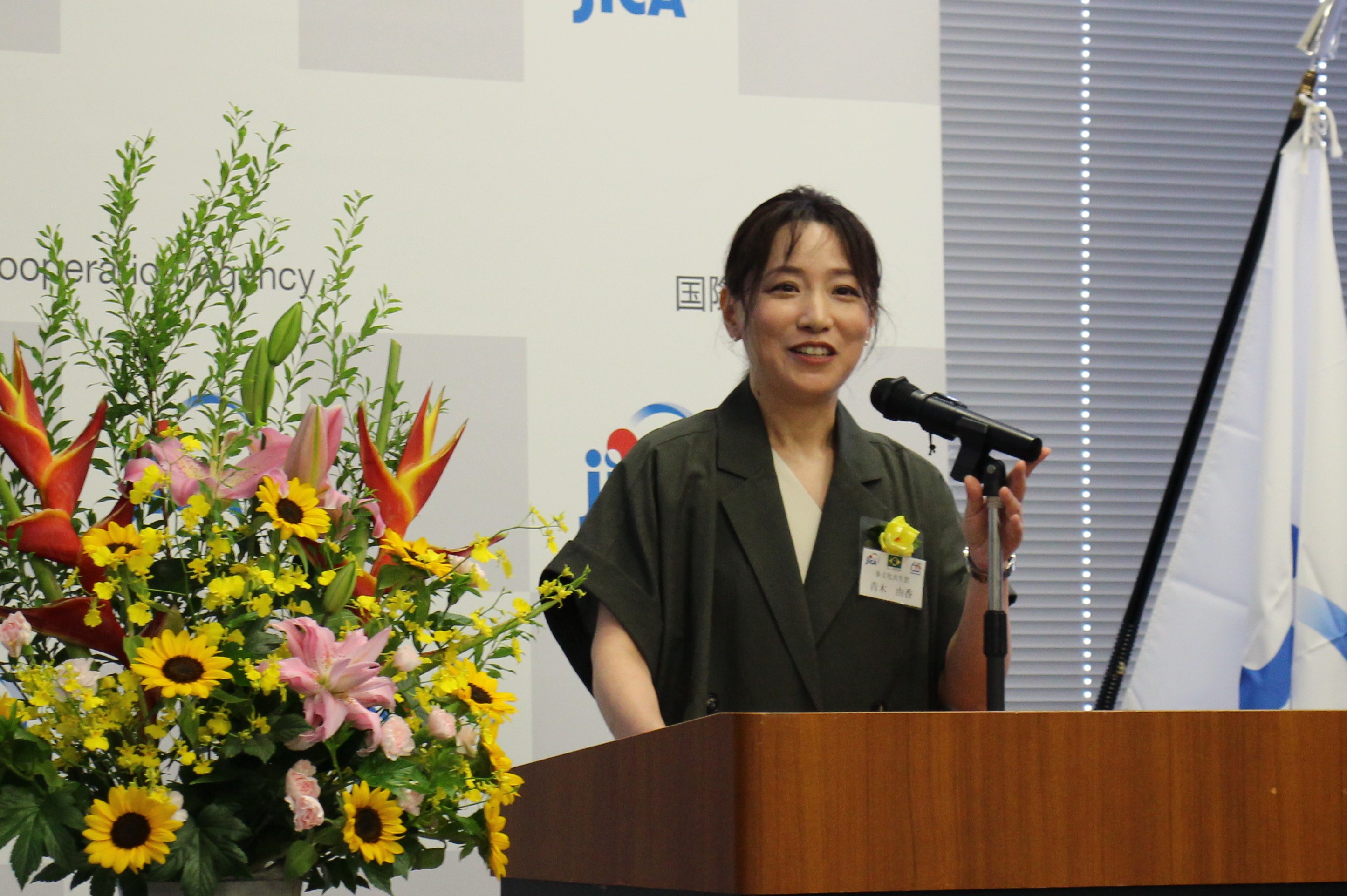 Aoki Yuka gives a presentation at the 3rd JICA Returned Volunteers Giving Back to Society ceremony.