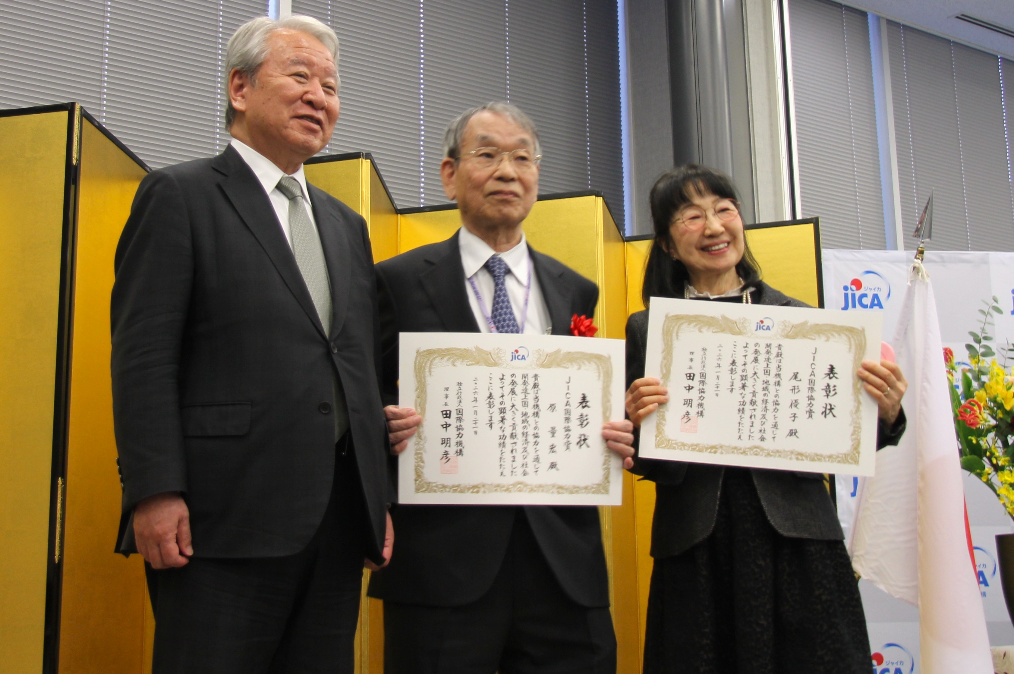 At the 2025 JICA International Cooperation Award Ceremony, JICA President Akihiko Tanaka poses alongside Kagawa University Professor Emeritus Hara Kazuhiro and Melody International’s CCO Ogata Yuko.