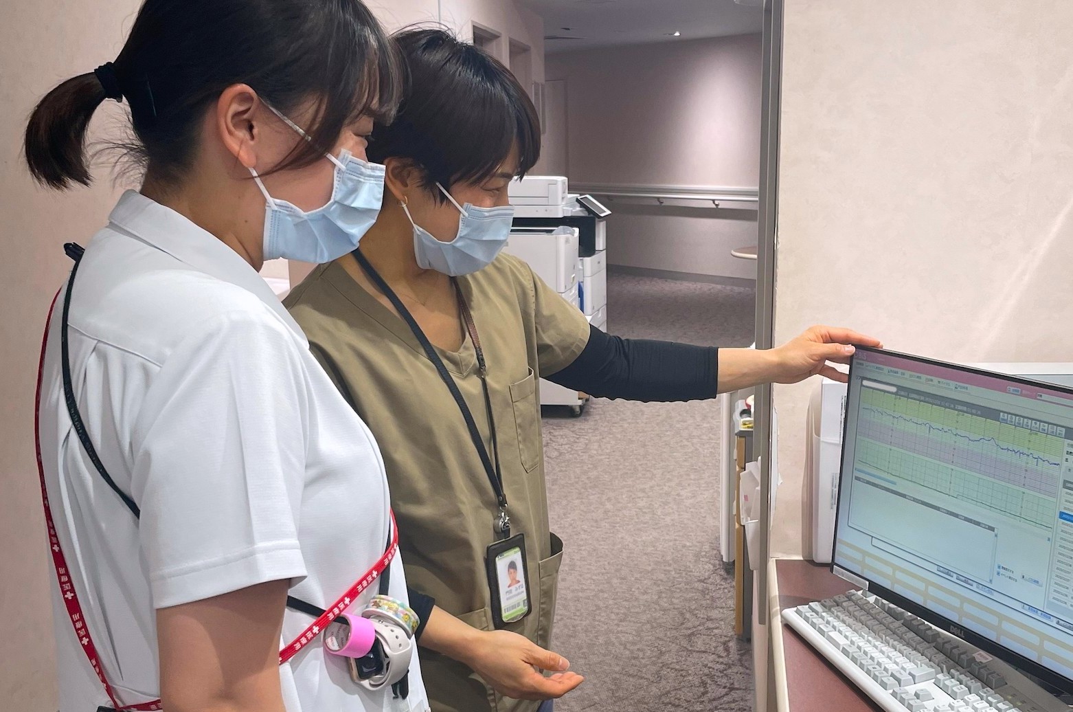 Physician Kadooka Mizuho (right) checks iCTG data transmitted from a pregnant woman’s home together with a midwife at Kameda Medical Center in Kamogawa, Chiba Prefecture. (Image courtesy of Kameda Medical Center)