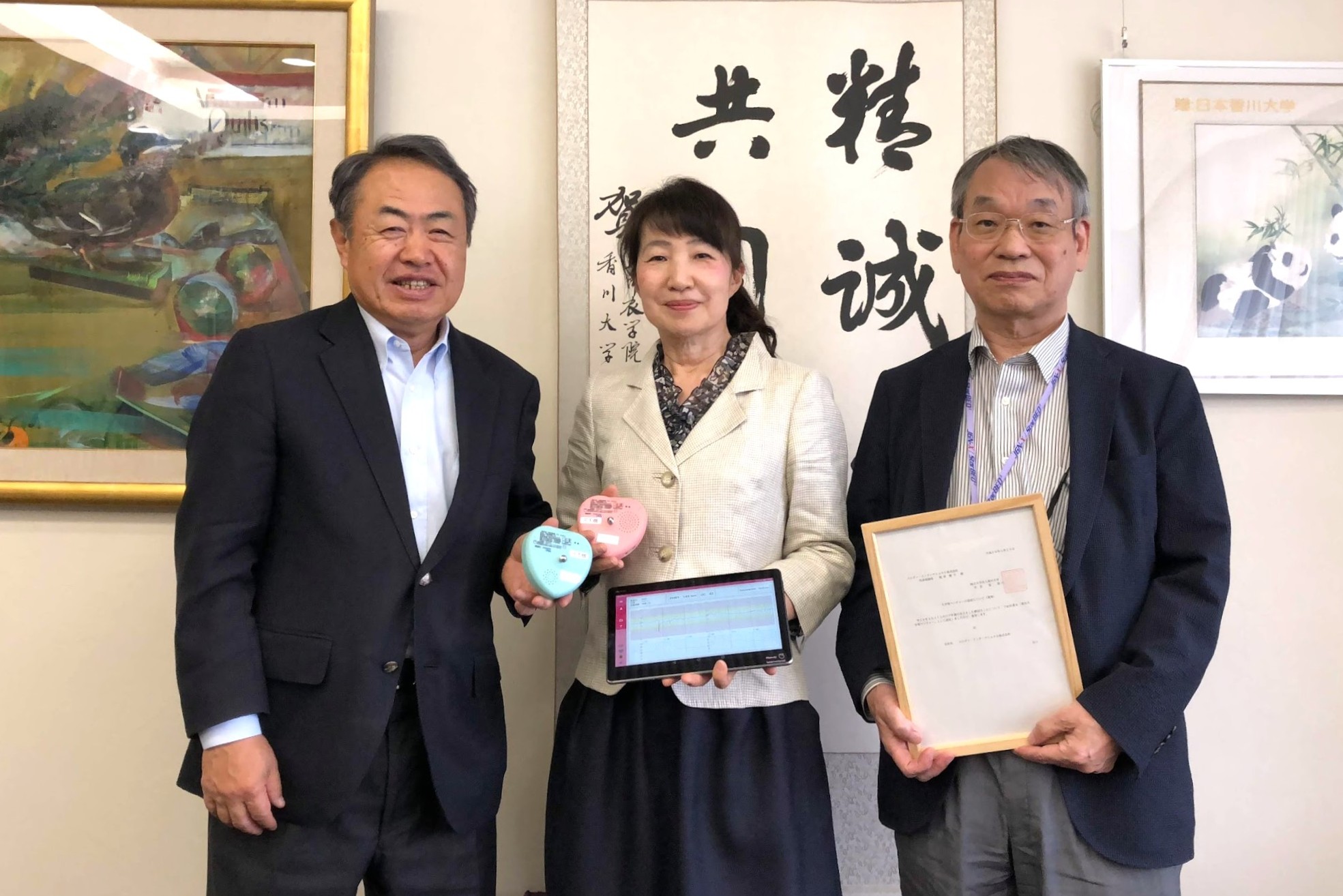 Melody International CEO Ogata Yuko (center), recipient of a Kagawa University Startup certification in 2018, poses with Kagawa University President Kakehi Yoshiyuki (left) and Specially Appointed Professor Hara Kazuhiro. (Image courtesy of Melody International Inc.; titles current as of 2018)