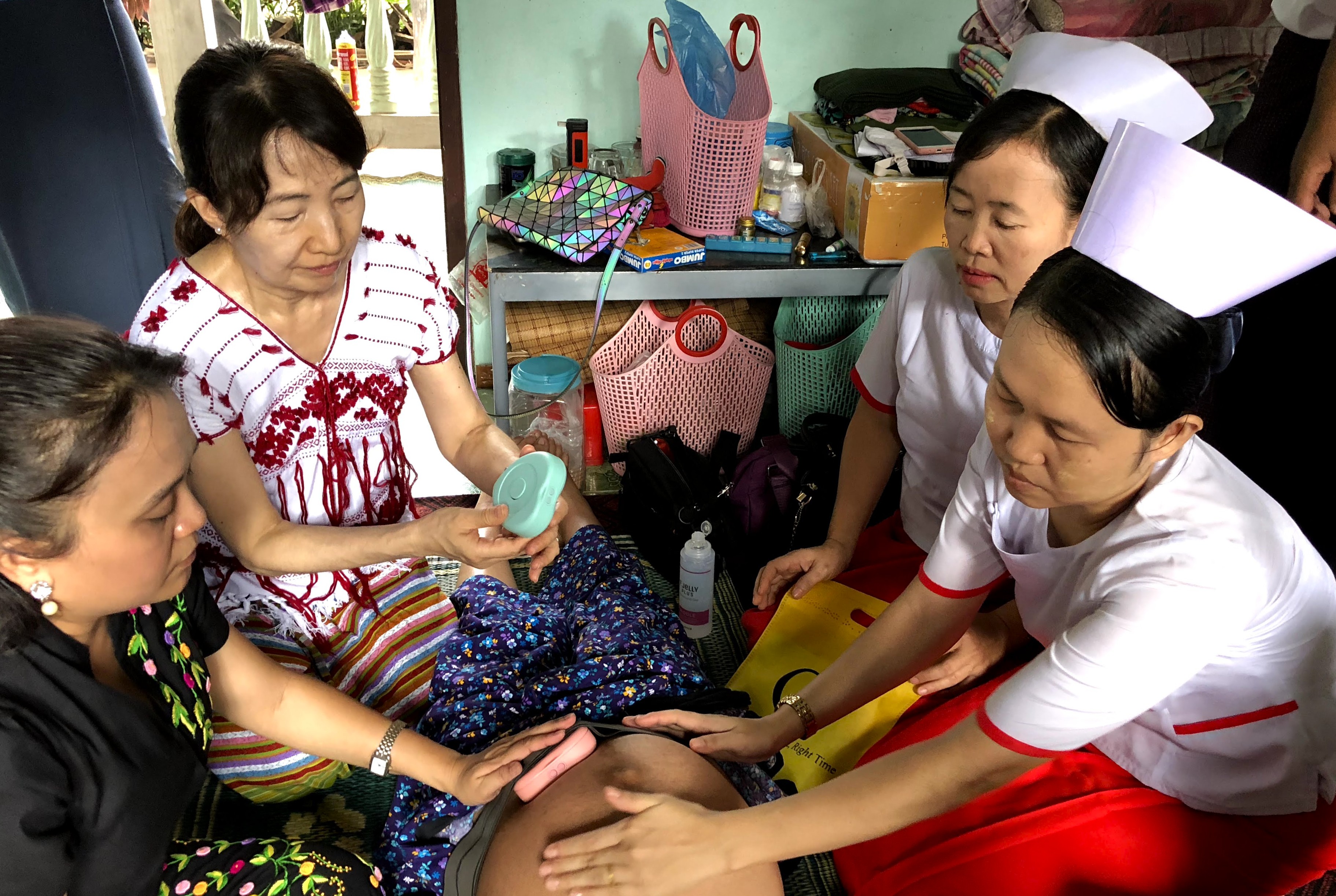 At a private home in Myanmar, Ogata Yuko (second from left) teaches healthcare staff and an expectant mother how to use the portable fetal monitor device iCTG. (Image courtesy of Melody International Inc.)