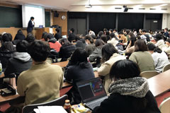 Participants from JICA-RI included Visiting Fellow Yasunobu Okabe, a professor at Tohoku University, Research Fellow Mayuko Onuki, and Eriko Sakamaki, a JICA-RI staff member and former JOCV. In front of 75 members of a group of students from Kanazawa University and the general participants at the Campus venue, Sakamaki took to the stage first to give an overview of the JOCV program and relate her own experiences as a JOCV. Next, Okabe gave a presentation titled "The Developmental Achievements of Japan Overseas Cooperation Volunteers: From the Perspective of Social Capital."