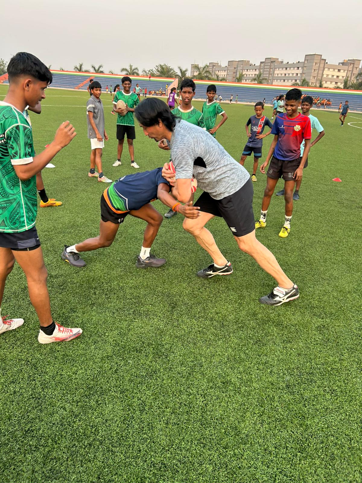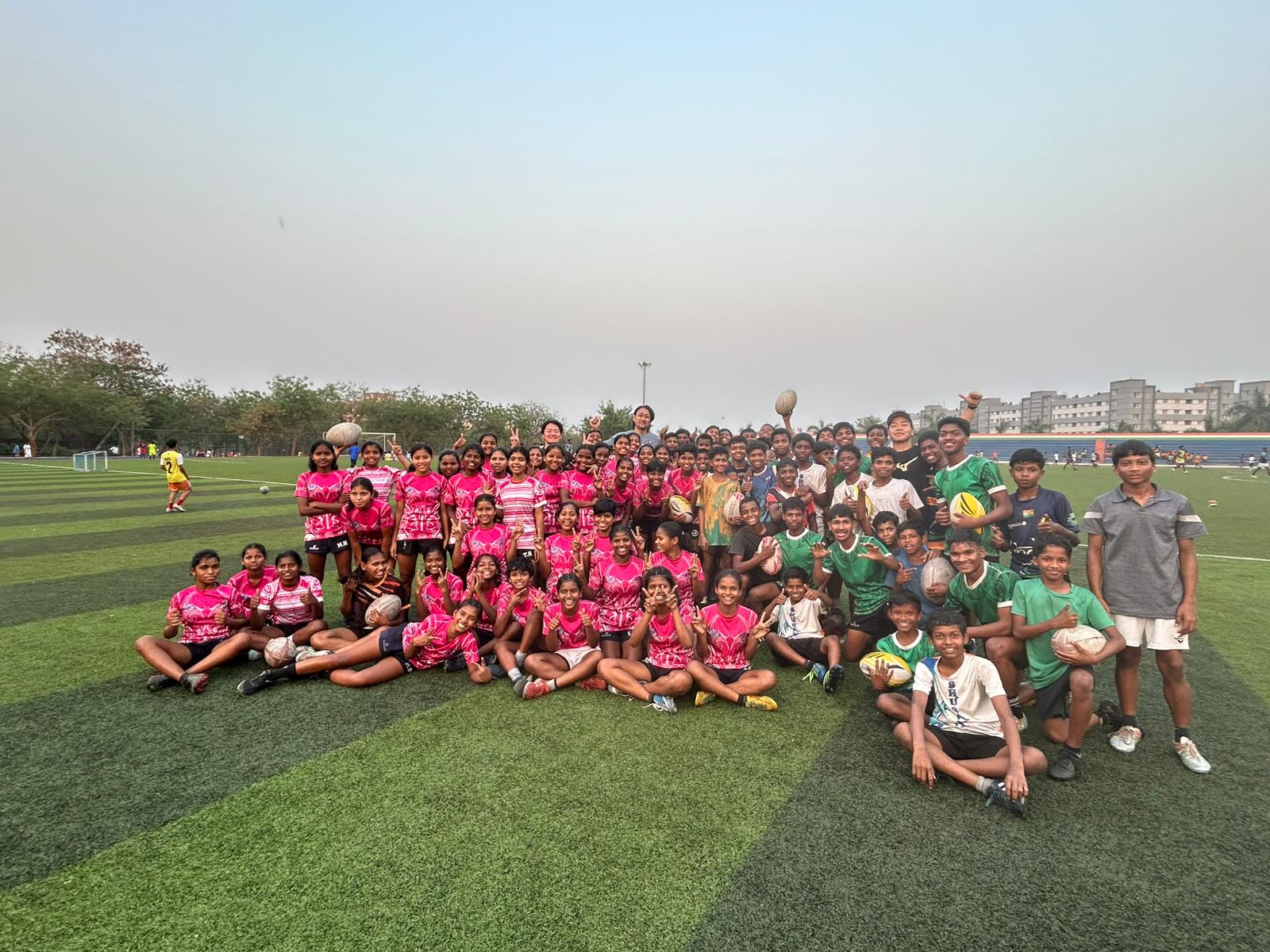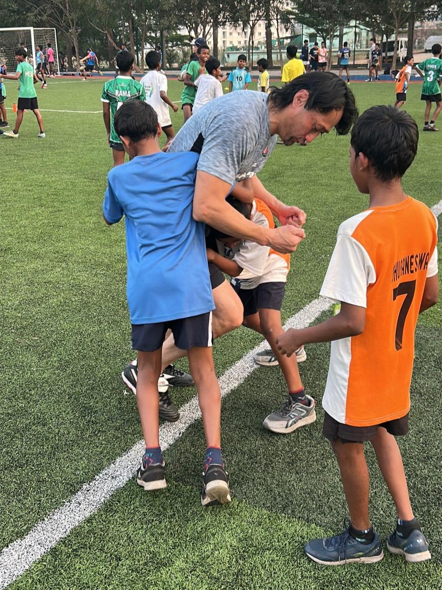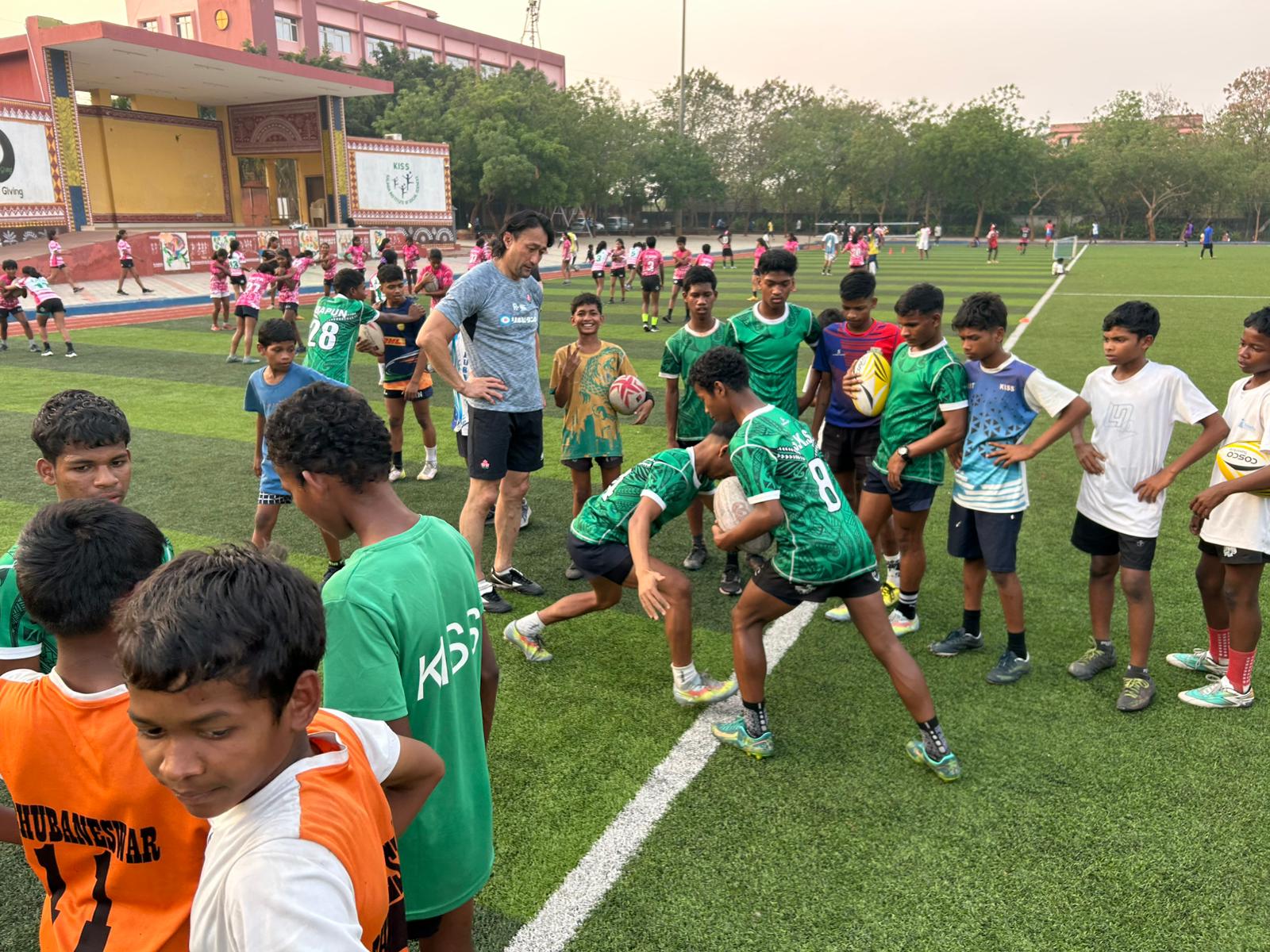 In Bhubaneswar, Odisha, the delegation undertook extensive field engagements at the Kalinga Institute of Social Sciences (KISS) and the Kalinga Institute of Industrial Technology (KIIT). Interacting with hundreds of students across primary, middle school, and university levels, Mr. ONO conducted multiple coaching sessions aimed at building technical skills and instilling the core values of rugby.