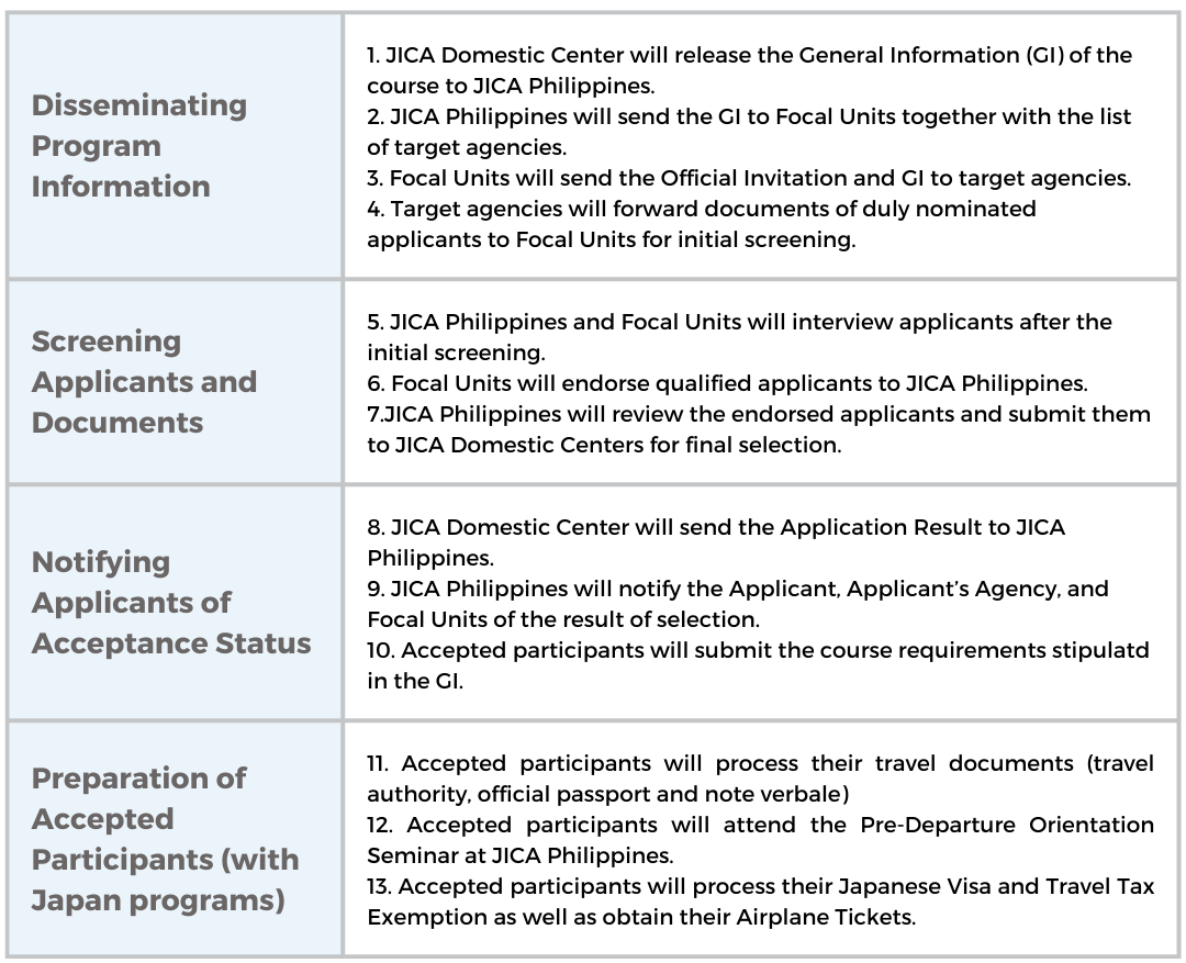 Majority of JICA's training programs are for government employees only. However, there are few courses wherein NGOs and private sector can also apply. Call JICA's Training Program Section at (02) 8889-7119 to inquire on the target agencies of the courses.