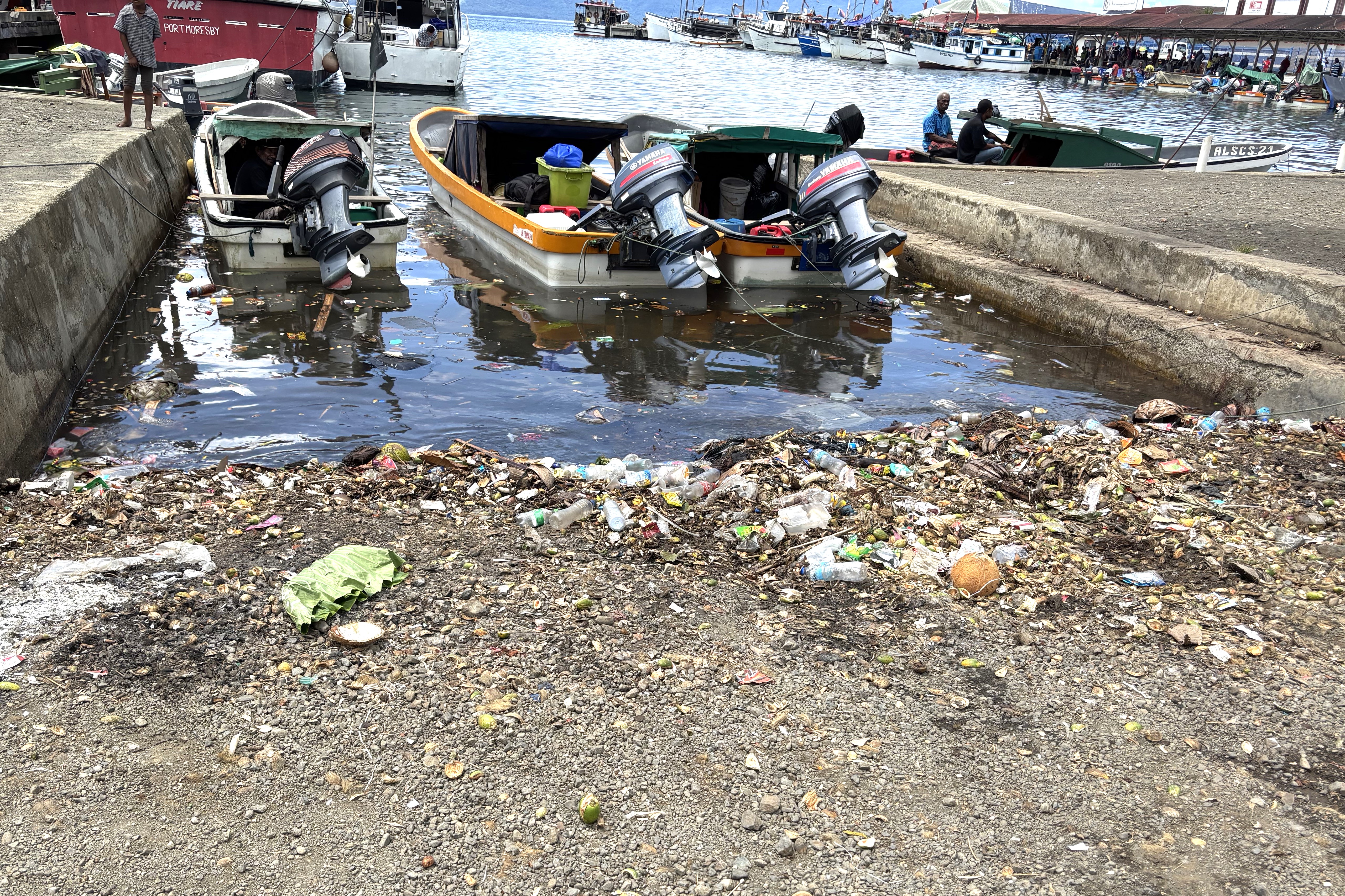 Trash piles up even under the pier where boats pass by.