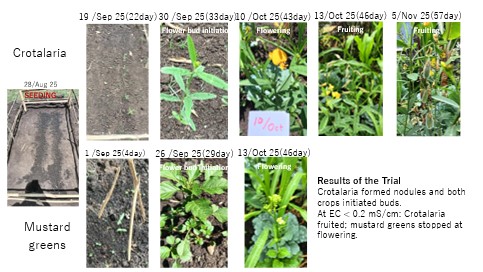 Mustard managed to flower; however, pod formation was poor due to nitrogen deficiency. In contrast, Crotalaria showed flower bud formation and pod development, along with the presence of root nodules. Crimson Clover suffered insect damage shortly after germination, indicating the need to reassess local conditions.