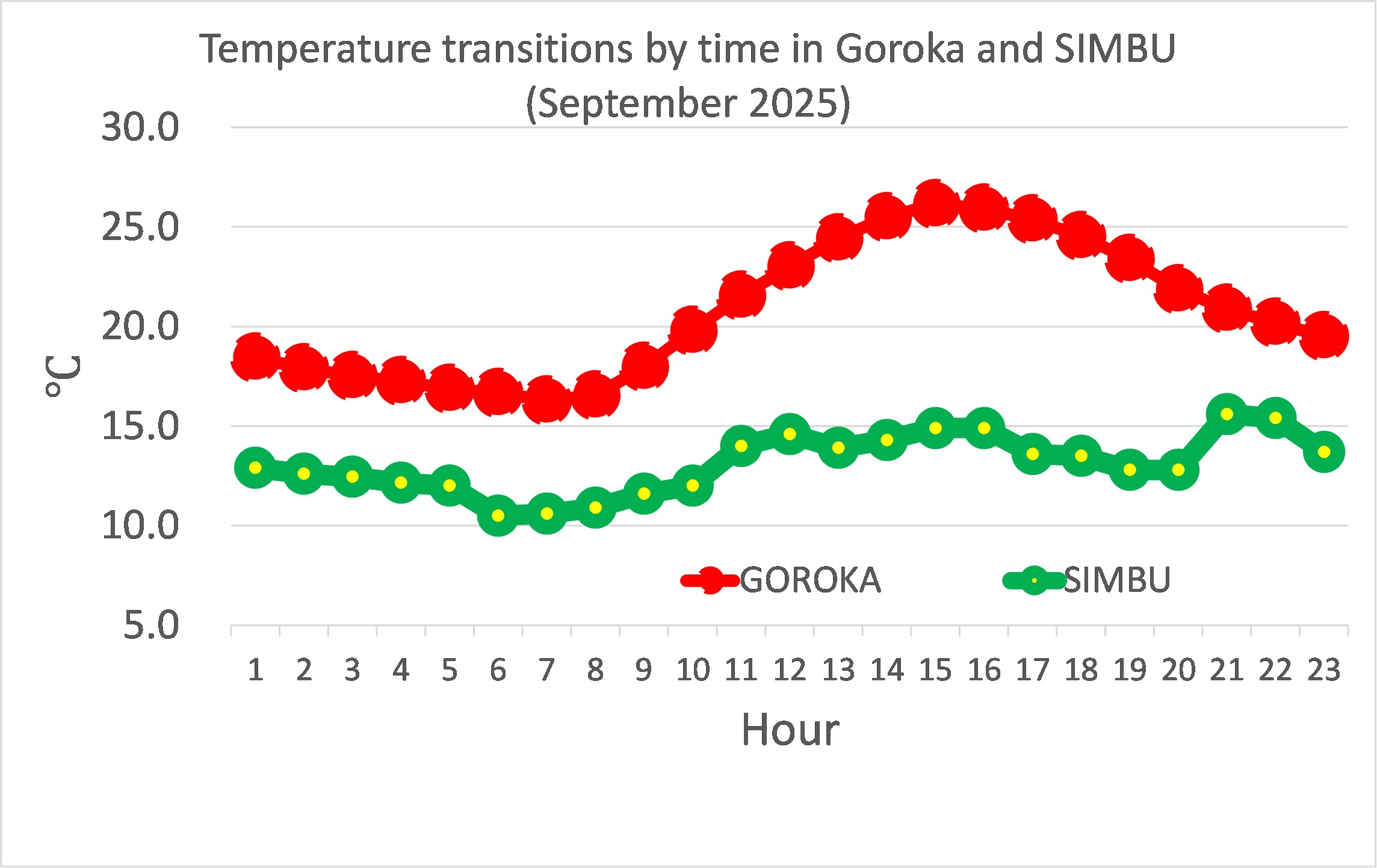 Figure 1: Temperature comparison between Goroka town and Simbu farmers’ fields. (Note: Goroka shows monthly averages; Simbu shows averages for September 16–18).