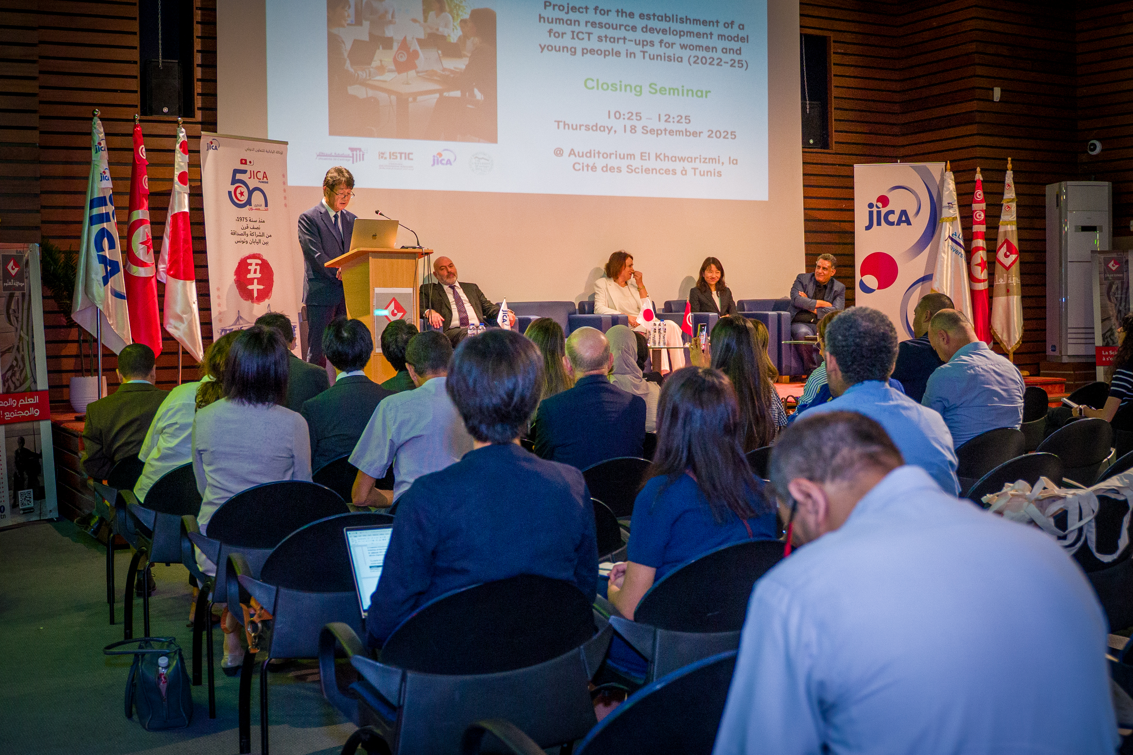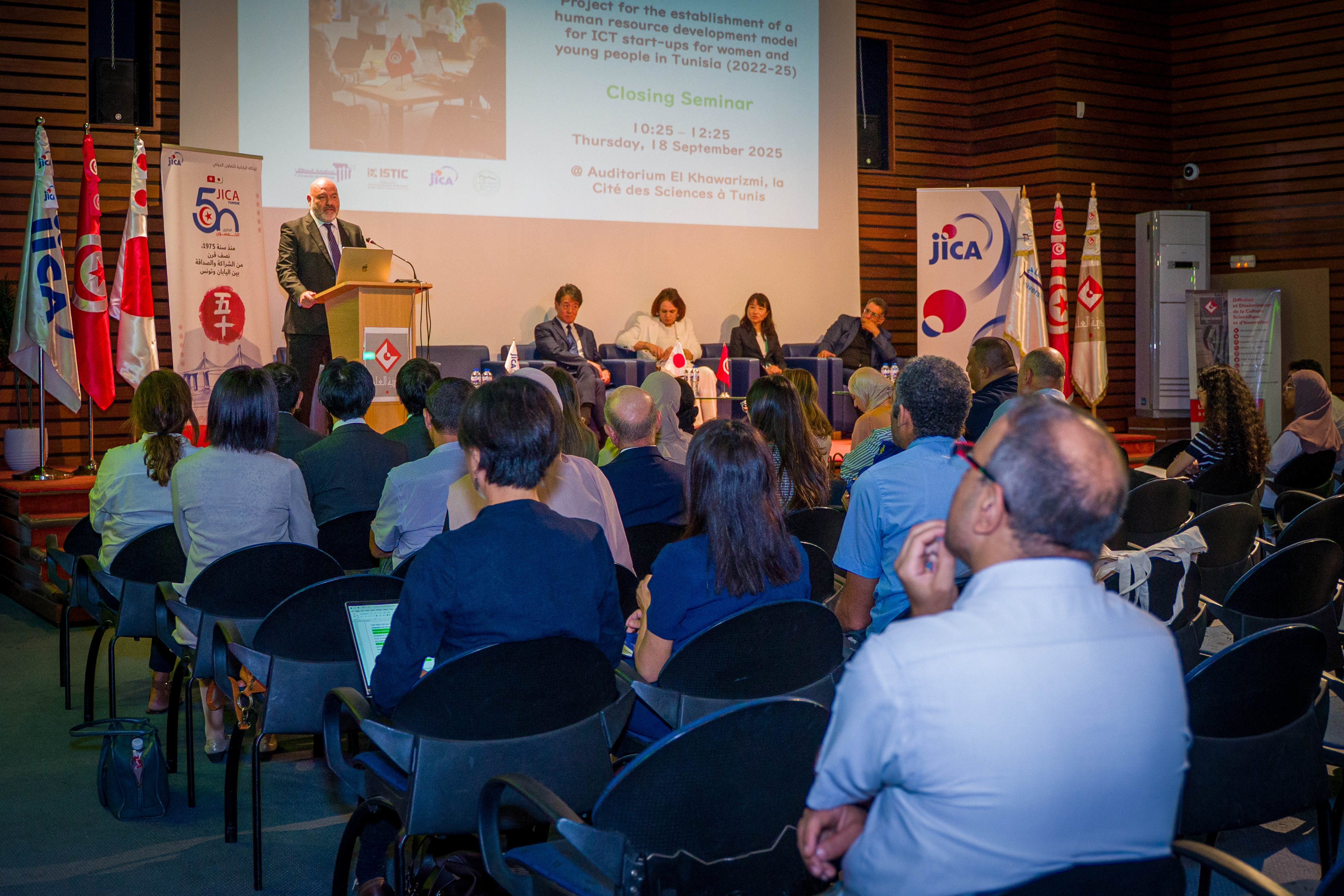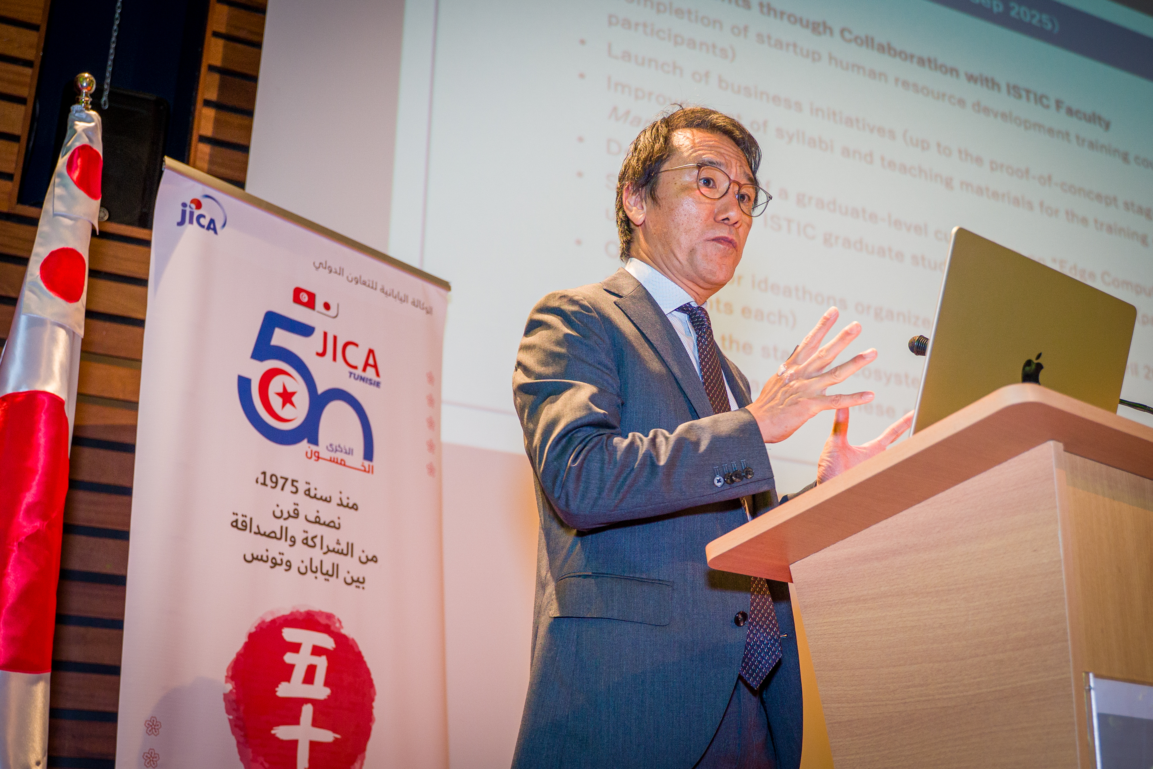 Les trois éditions de formation destinées à 29 étudiants, porteurs d’idées de projets, ont été tenues durant les trois ans du projet, conduites par des formateurs japonais et tunisiens. Un manuel pédagogique de formation a été élaboré afin d’enrichir le contenu pédagogique basé sur l'expérience mondiale et japonaise. Six enseignants de l’ISTIC ont été formés dans les divers cours et activités et ont pu se rendre au Japon pour l’échange des connaissances en matière de développement des compétences entrepreneuriales. En parallèle, quatre conférences spéciales et plusieurs séminaires ont été organisées avec la participation de près de 300 étudiants et jeunes entrepreneurs. Lors de la cérémonie de clôture, deux start-uppeurs ont présenté l’avancement de leurs projets. Notons que grâce à ce projet, une startup a été créé et deux autres sont en cours de création. La cérémonie s’est tenue en présence de Son Excelllence M. Takeshi OSUGA, Ambassadeur du Japon en Tunisie, de M. Malek KOCHLEF, Directeur Général de la Coopération Internationale au Ministère de l'Enseignement Supérieur et de la Recherche Scientifique, de Mme Nadia MZOUGHI AGUIR, Présidente de l’Université de Carthage, de M. Abderrazek BEN ABDALLAH, Doyen de l’Université d’Aizu, de M. Lazhar MANAI, Directeur de l’ISTIC et de Mme Mayumi MIYATA, Représentante Résidente de la JICA.