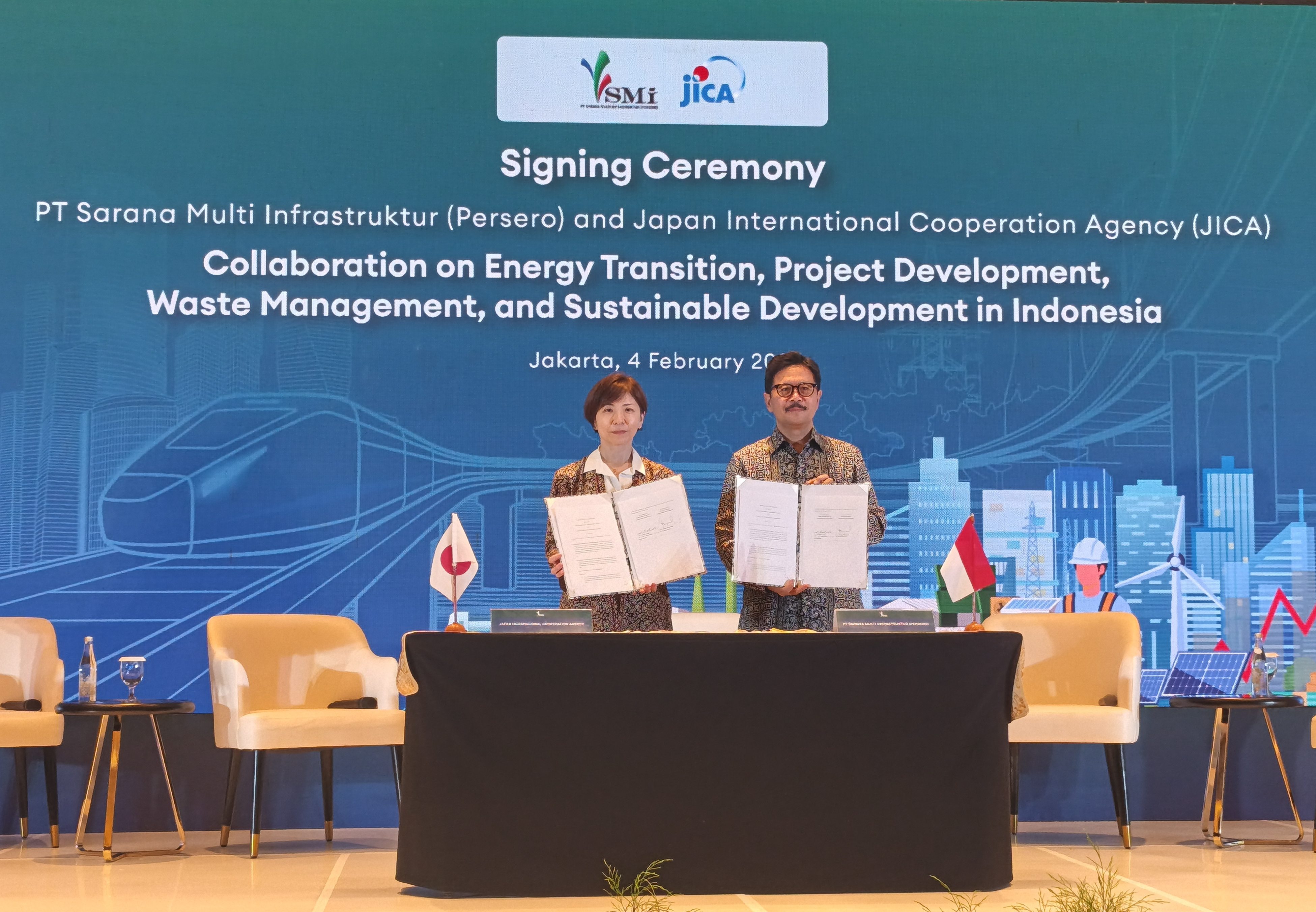 Pada tanggal 4 Februari 2026, Japan International Cooperation Agency (JICA) menandatangani Nota Kerja Sama (Memorandum of Cooperation/MoC) dengan PT. Sarana Multi Infrastruktur (PT SMI), sebuah perusahaan pembiayaan infrastruktur milik negara di bawah Kementerian Keuangan Republik Indonesia. MoC tersebut mencakup kerja sama terkait pengembangan infrastruktur dan transisi energi di Indonesia.