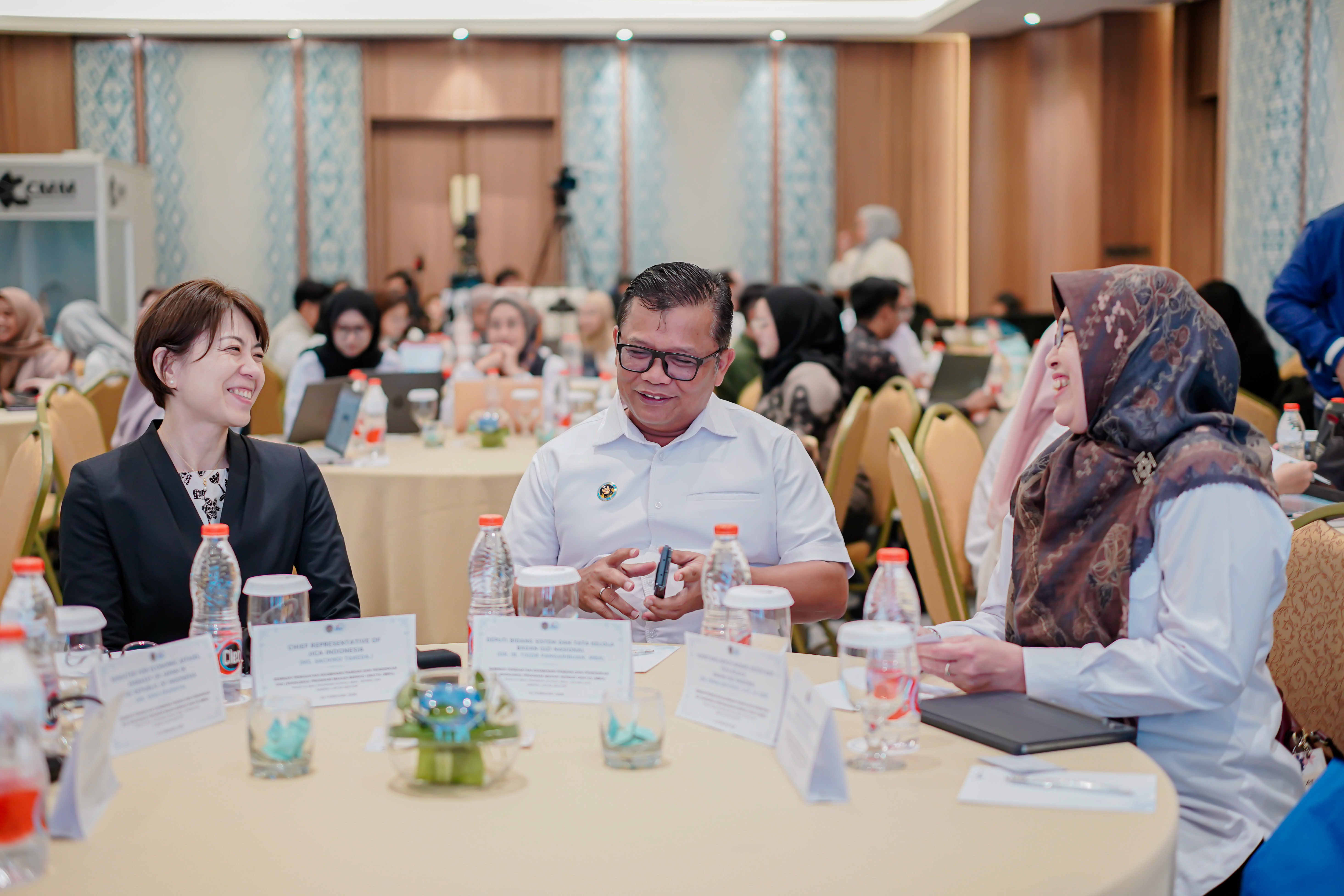 (kiri-kanan) Takeda Sachiko, Dr. Ir. Tigor Pangaribuan, dan salah satu peserta seminar berbincang pada seminar Penguatan Keamanan Pangan dan Edukasi Gizi (Shokuiku) dalam Implementasi Program Makan Bergizi Gratis (MBG): Praktik Baik Program School Meal Jepang dan Sinergi Lintas Sektor” pada Selasa (3/2) di Hotel Bidakara, Jakarta.