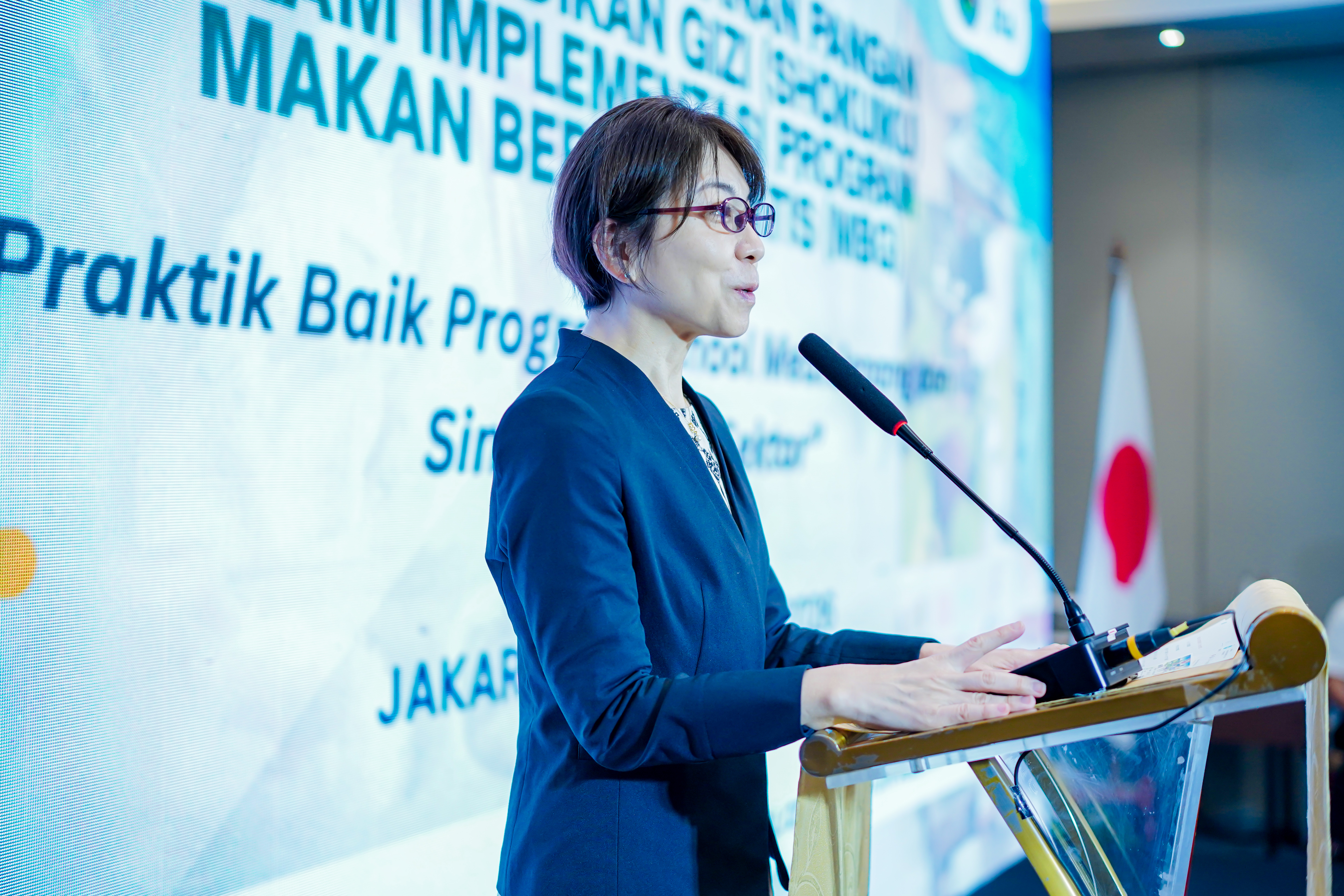 Takeda Sachiko, Chief Representative of JICA Indonesia, memberikan sambutan di depan peserta seminar Penguatan Keamanan Pangan dan Edukasi Gizi (Shokuiku) dalam Implementasi Program Makan Bergizi Gratis (MBG): Praktik Baik Program School Meal Jepang dan Sinergi Lintas Sektor” pada Selasa (3/2) di Hotel Bidakara, Jakarta.