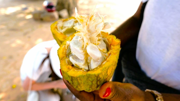 収穫されたカカオ。果肉の中のカカオ豆がチョコレートの原料になります