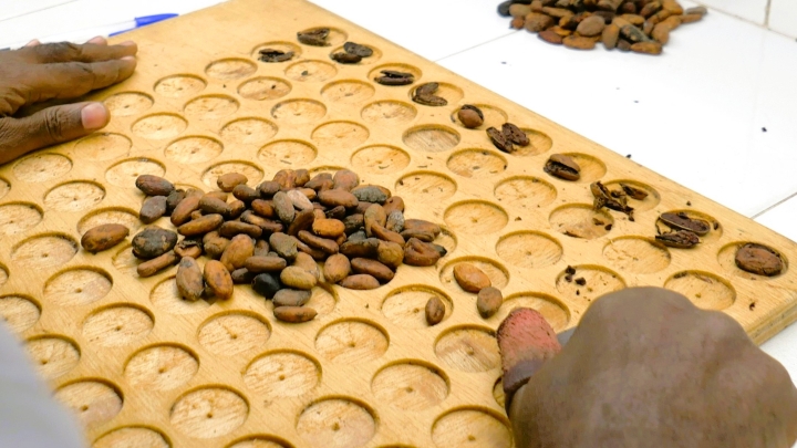 カカオの発酵度合いの検査。発酵・乾燥工程を改善することで、高品質なカカオが増える可能性があります