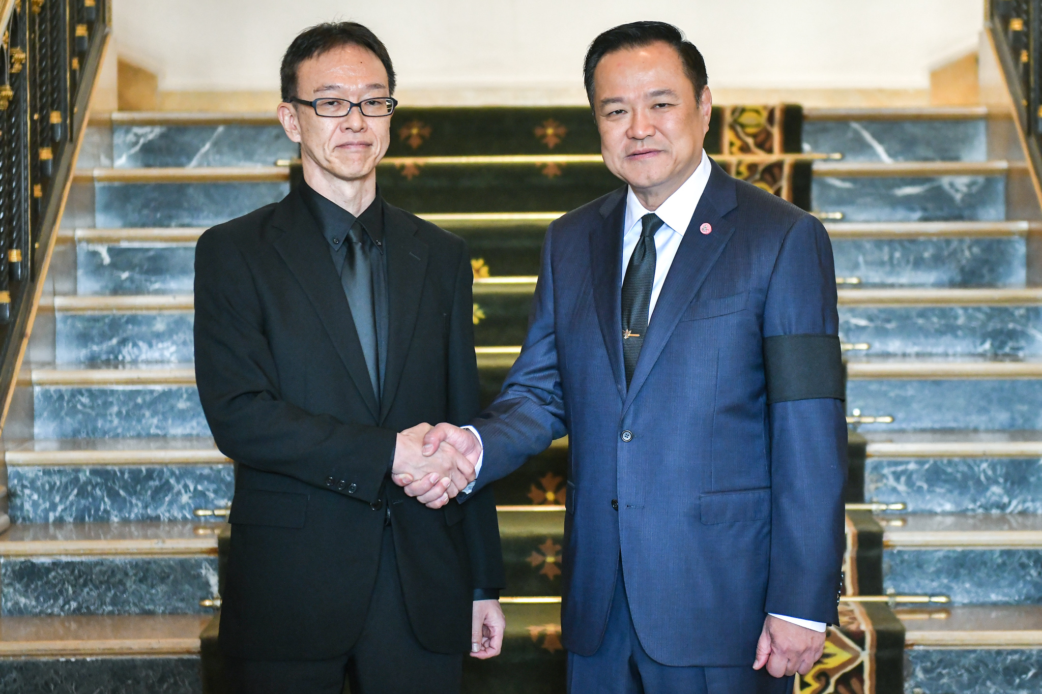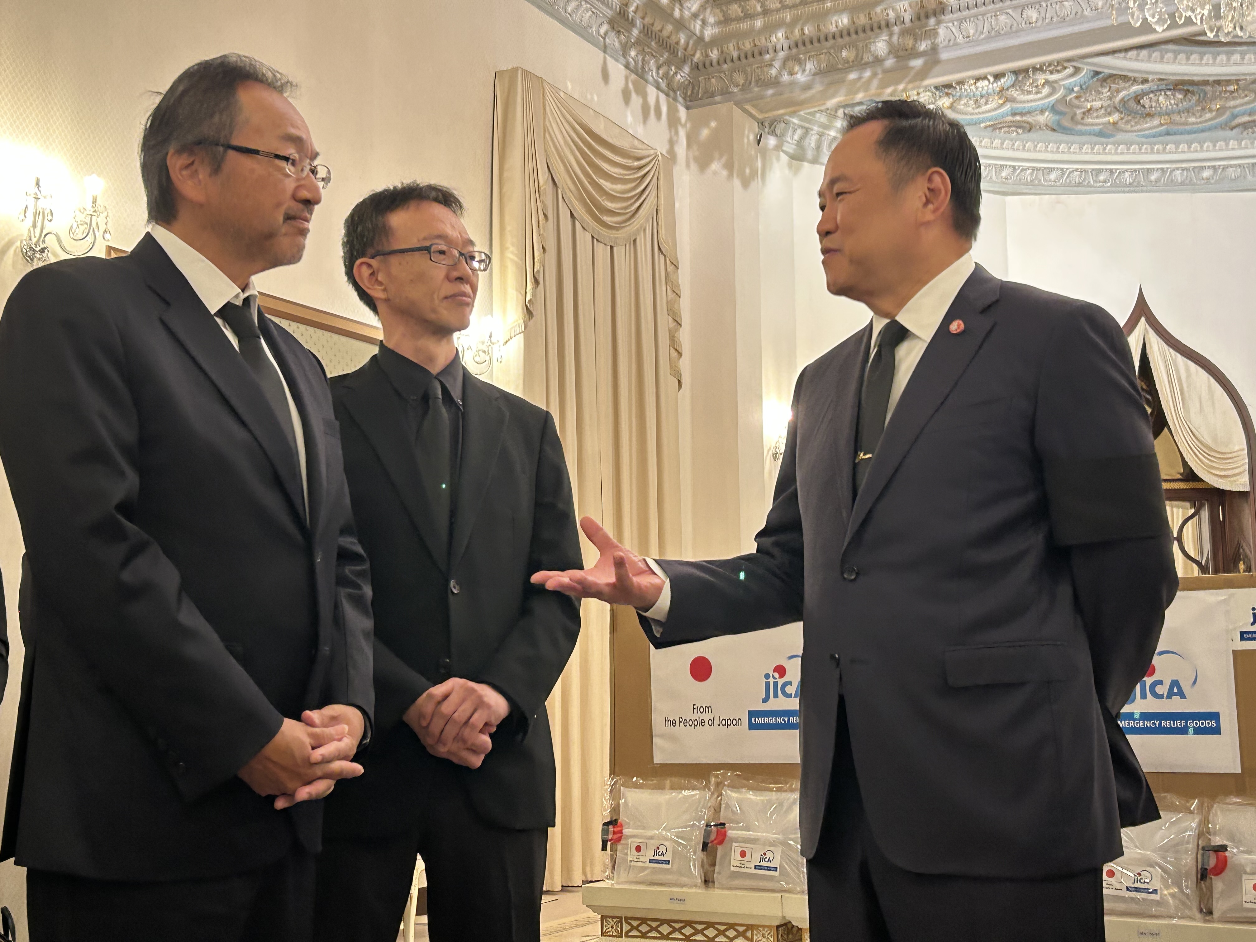 タイ国に対し供与する緊急援助物資は12月1日に首都バンコクに到着しました。翌2日(火)9時30分(現地時間)よりタイ首相府にて、タイ側からアヌティン・チャーンウィーラクーン首相、バウォーンサック・ウワンノー副首相、エックニティ・ニティタンプラパート副首相兼財務大臣、日本側から大鷹正人 駐タイ日本国大使、作道俊介 JICA タイ事務所長らが出席し、同物資の引渡式を実施しました。