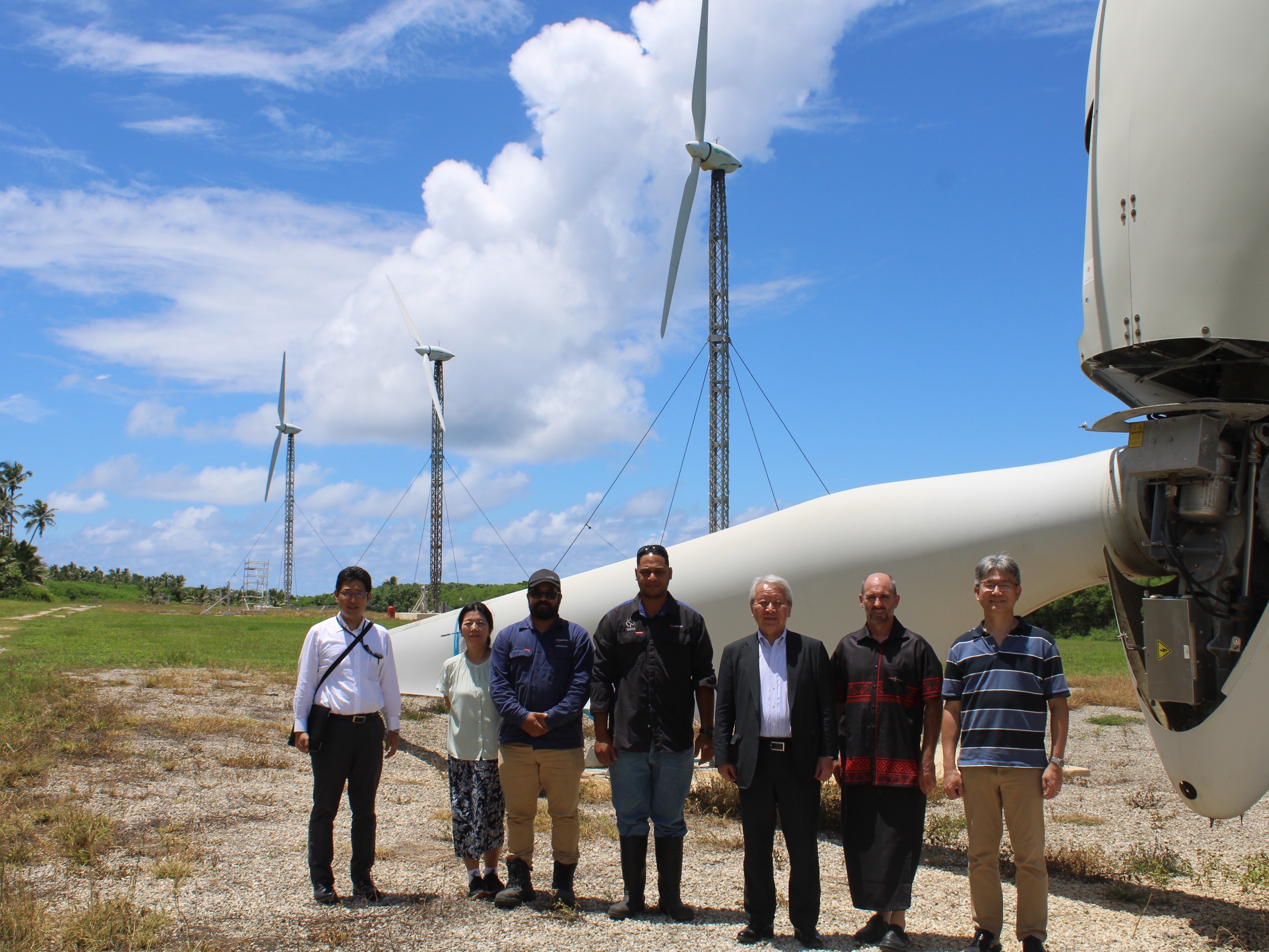 また、トンガタプ島の風力発電施設の訪問では、無償資金協力「風力発電システム整備計画」で導入された設備を視察し、再生可能エネルギー導入による電力供給の安定化と、気候変動対策への貢献を確認しました。本設備に含まれている可倒式発電施設は日本企業の技術が基盤となり、官民連携による技術展開が同国への継続的なエネルギー分野支援に繋がっていることを確認しました。