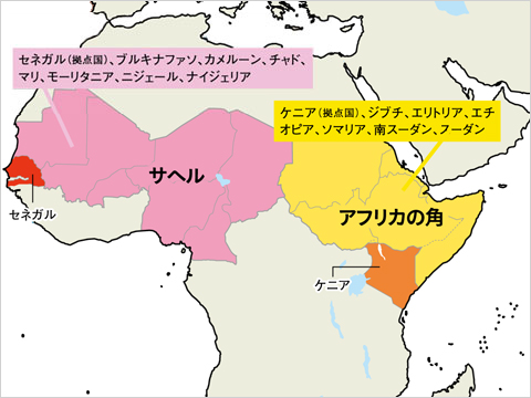 ケニア(拠点国)、ジブチ、エリトリア、エチオピア、ソマリア、南スーダン、スーダン