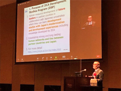 第1部の国際シンポジウムでは、SyDEプログラムを運営する各研究科の教授や、同プログラムを推進する連携企業・団体・研究機関による講演が行われ、同プログラムの紹介や、各研究分野における防災の課題について共有されました。JICA永見防災グループ長からは、2030年まで残り10年となった仙台防災枠組への貢献のためのJICA防災協力方針として、同枠組みのグローバルターゲットaからdに明記された人的被害及び経済損失削減に注力していくこと、そのためには気候変動影響や途上国における都市化進展もふまえ構造物対策を中心とした事前防災投資に一層力を入れていく必要があることを強調しました。さらに具体事例として、フィリピン国マニラにおいて長年にわたりJICAが支援してきた治水対策、アジア・太平洋各国において能力強化されてきた数多くの防災推進組織、及び災害復興にとどまらず将来災害に備えるべく首都圏強靭化を同時に見据えたネパール地震復興について紹介しました。また、JICA開発大学院連携や留学生プログラムについても説明を行いました。