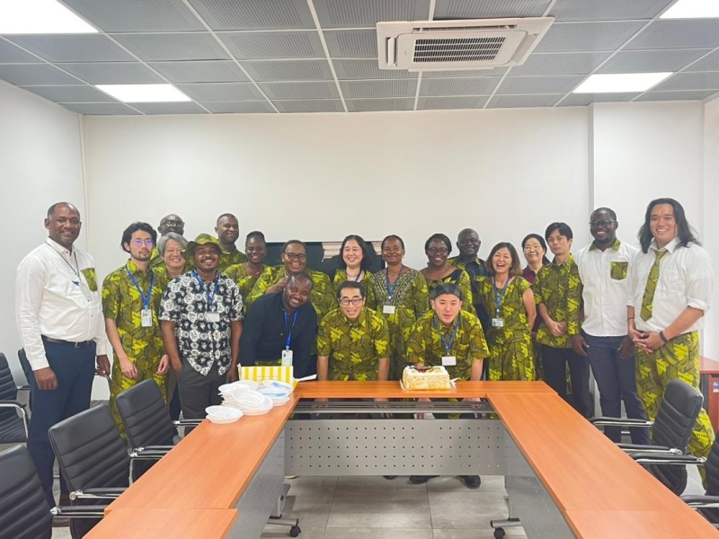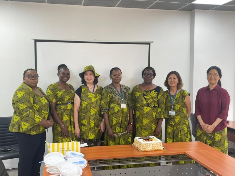 JICA事務所は毎年、3月8日の「女性の日」向けにアフリカの布パーニュ製のお揃いの服を作ってお祝いしています。自分たちの組織やJICAがコンゴ民主共和国で取組む全ての事業に、ジェンダー視点を取り入れていくための意識付けとしています。今年のパーニュには「Femme 8 mars(女性 3月8日)」とプリントされています。