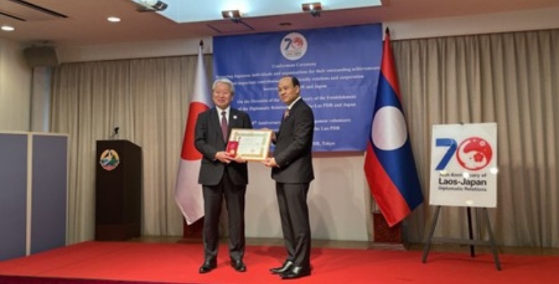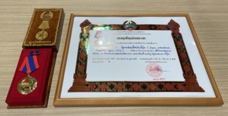 JICAは、長年のラオスへの協力を通してラオスの発展及び二国間の友好関係構築に貢献したと評価され、 ソーンサイ・シーパンドン首相の布告により、発展勲章一等(Development Medal First Class)を授賞しました。また、初代海外協力隊員である、大西規夫さん、竹下節子さんが、友好勲章(Cross of Friendship)を授賞しました。