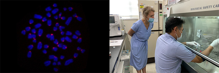 今回、ブルドー博士が日本で習得したのは、ネズミの染色体の異常を解析するための最新技術「FISH法(fluorescence in situ hybridization法)」です。このFISH法は、2色以上の蛍光染料を用いて染色体を染色し異常部を発見する、高度な経験と知識を必要とする手法です。