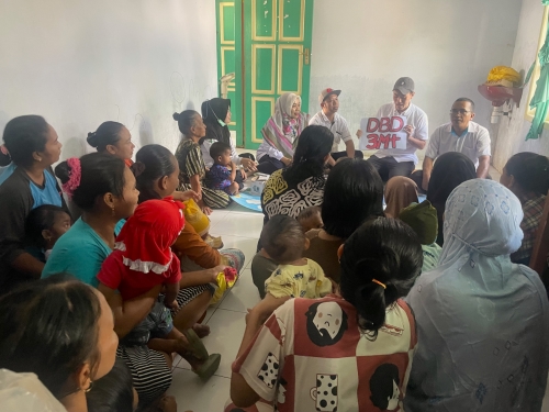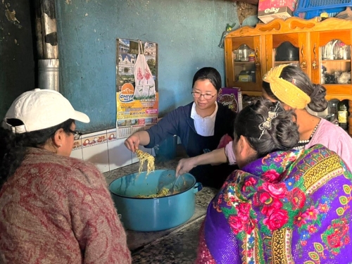 農村の家庭を訪問し、女性たちとともに調理実習を行う様子